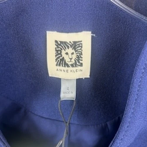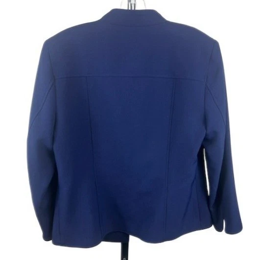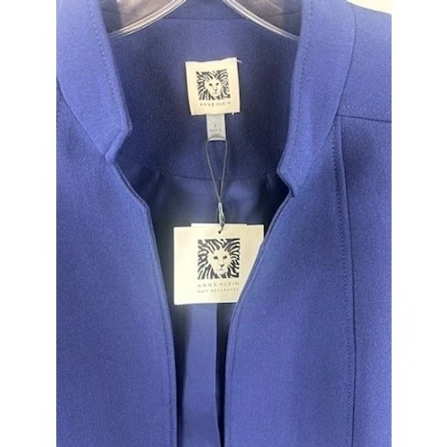 Anne Klein collarless open front blazer jacket. This stylish blue blazer is part of the suit separates collection, offering versatile styling options. Its polished design makes it perfect for professional settings, business casual events, or elegant evenings out.