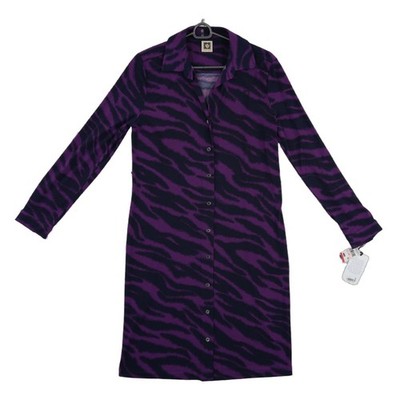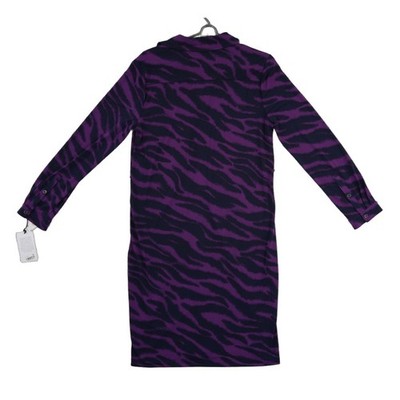New with tags! Anne Klein button-front shirt dress showcases a bold purple and black tiger stripe animal print on a comfortable stretch jersey fabric. This versatile piece features a classic pointed collar, long sleeves with button cuffs, and a full-length button placket. The straight silhouette offers a polished yet modern look suitable for office wear or evening outings.