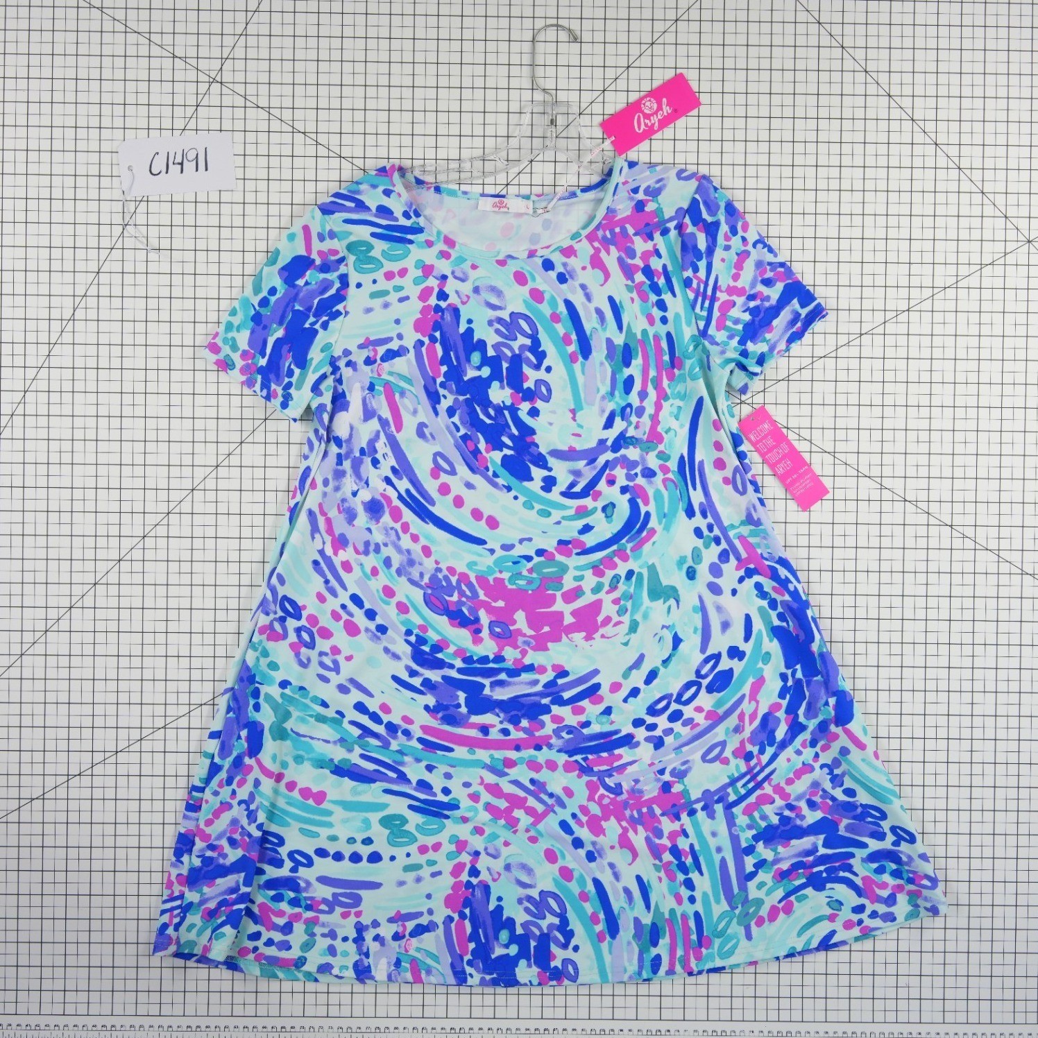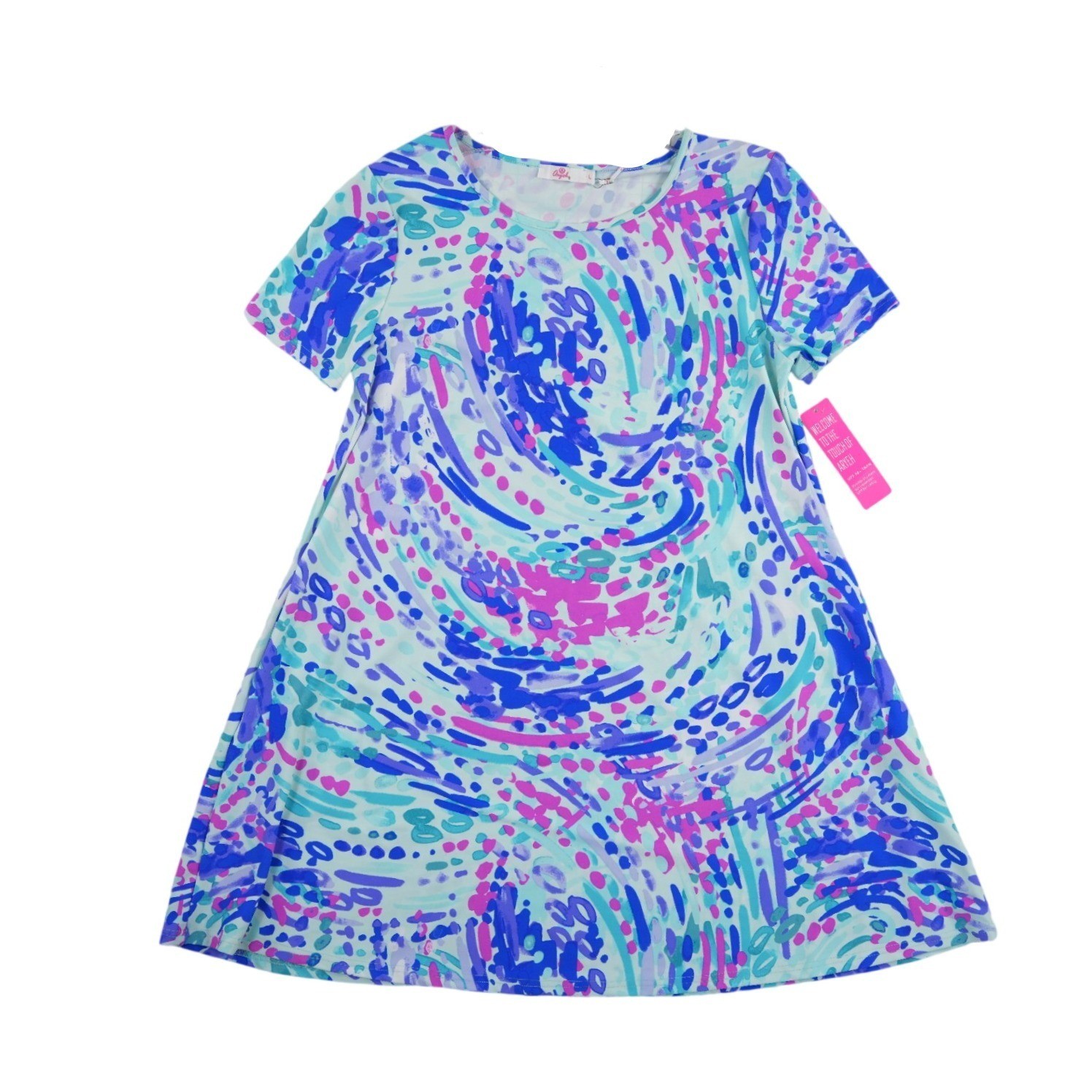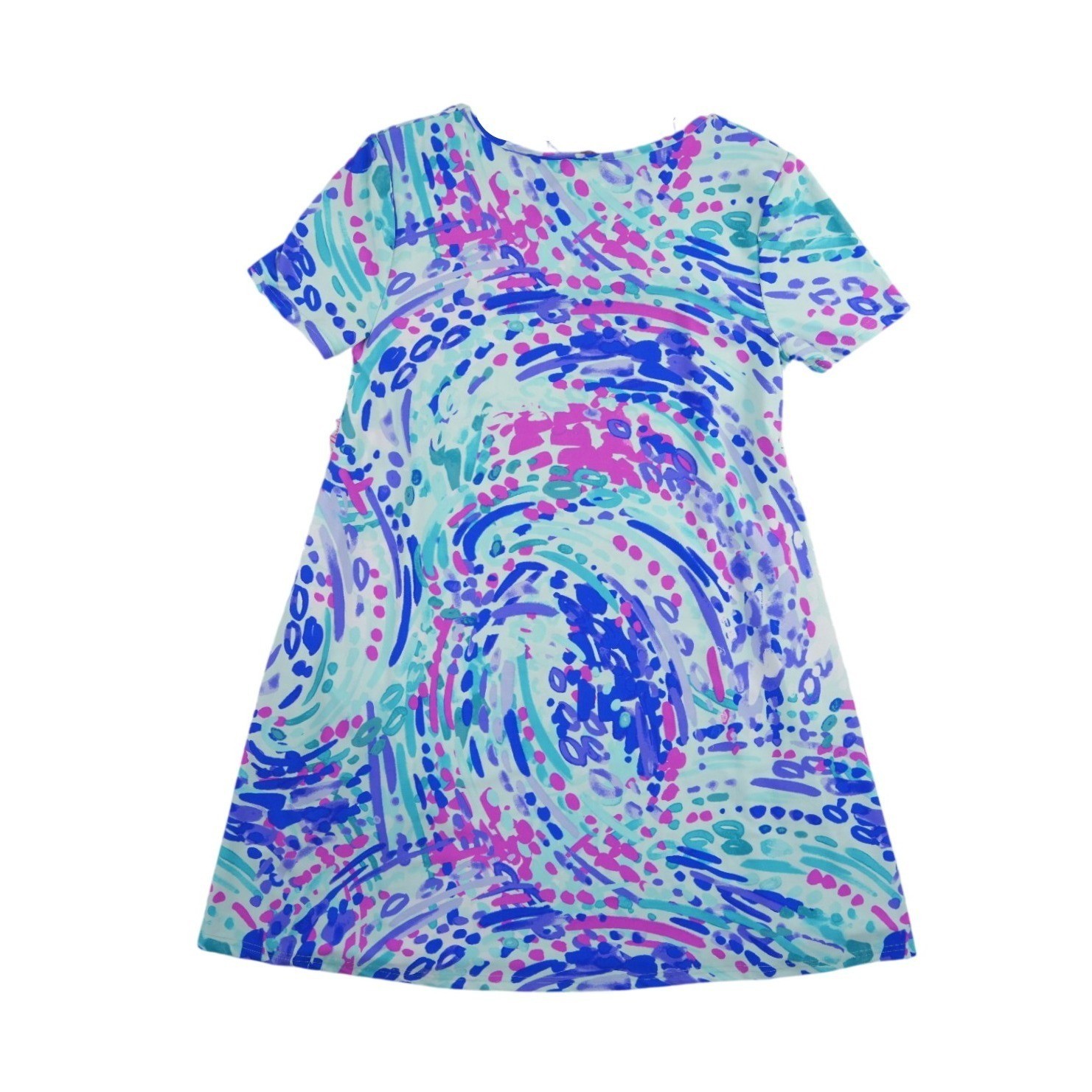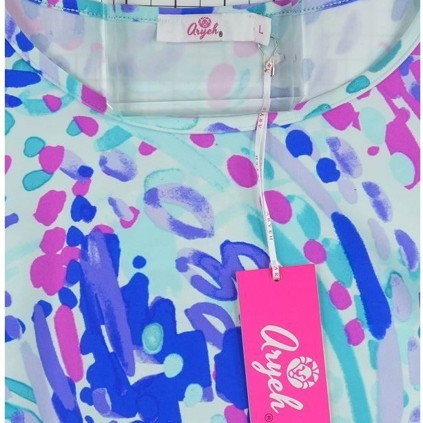 New with tags! Aryeh short sleeve A-line dress features a vibrant abstract swirl print in shades of blue, pink, and mint. Crafted from a comfortable nylon-spandex blend, this mini-length dress offers a flattering swing silhouette with a classic crew neckline. The lightweight, stretchy fabric makes it an ideal choice for resort wear or casual summer outings.