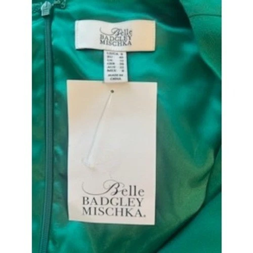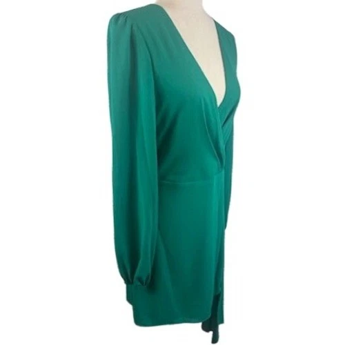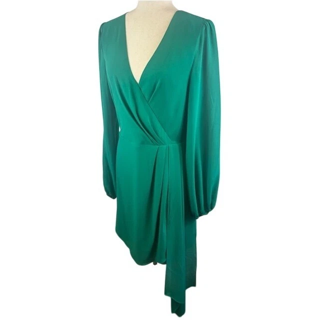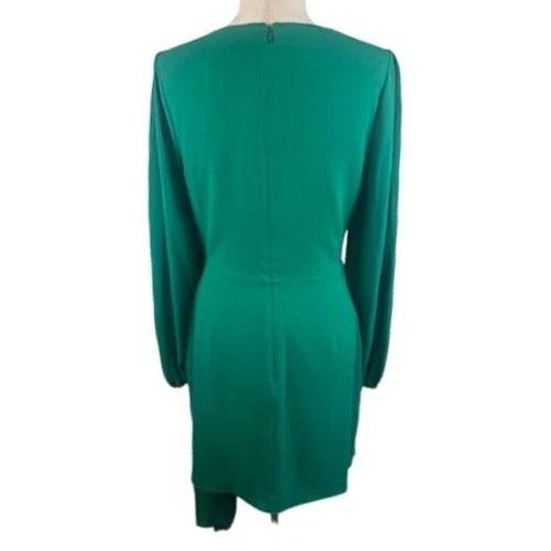 Chic and sophisticated, a beautiful green wrap dress from Belle Badgley Mischka. This dress features a flattering V-neckline and elegant long sleeves that gather at the wrists, creating a subtle balloon effect. The wrap design cinches at the waist with a tie closure, offering an adjustable and figure-enhancing fit. Its rich green color exudes a sense of luxury and is perfect for a variety of occasions. This dress would be a standout choice for cocktail parties, evening events, or a sophisticated dinner date.