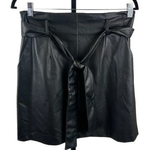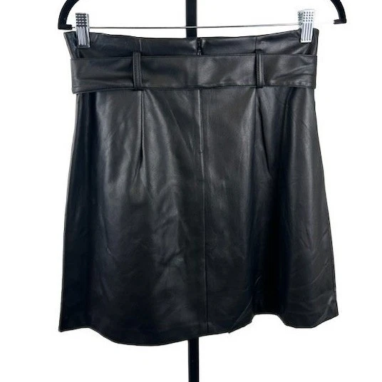 Sleek and stylish faux leather mini skirt for versatile styling. This chic black skirt features a flattering A-line silhouette, complemented by a coordinating belt that cinches at the waist for a defined look. The skirt also includes practical details like side pockets and a smooth lining for comfort. The faux leather material adds a touch of edgy sophistication, making it suitable for both professional and social settings. Perfect for a night out, a business casual office, or a trendy weekend brunch.