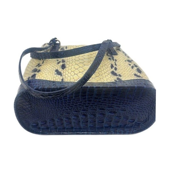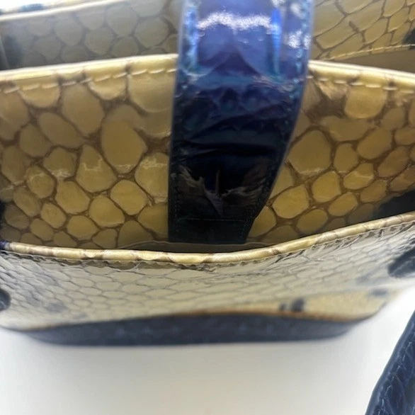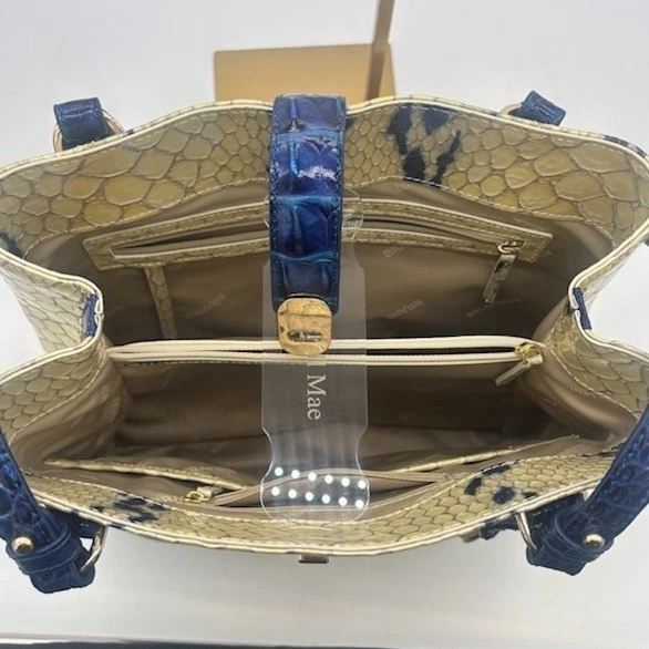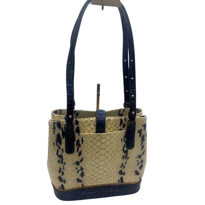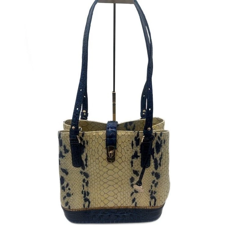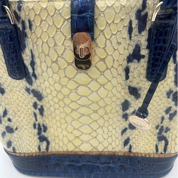 NEW! This bag measures 12x11x6. Chic snakeskin-embossed leather tote bag by Brahmin, a stylish and functional accessory for everyday use. Notable features include a structured silhouette, accented with contrasting navy blue trim for a sophisticated touch. The bag boasts a secure turn-lock closure, a spacious interior with multiple compartments, and sturdy double handles. Ideal for adding a touch of elegance to your office attire or completing a polished weekend look.