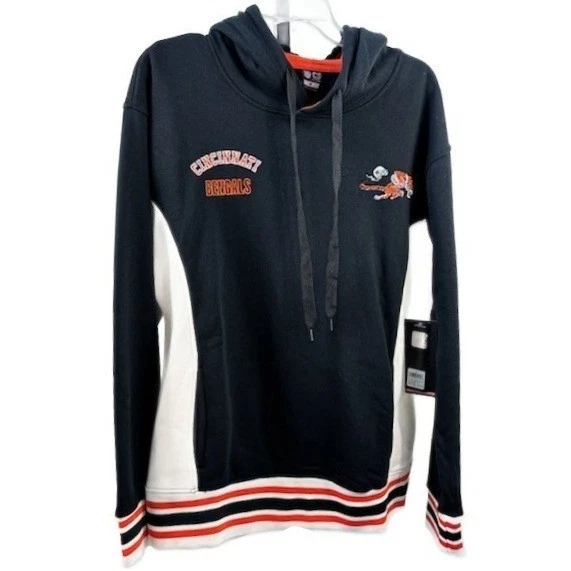 This Cincinnati Bengals NFL Ultra Game hoodie sweatshirt measures 28 inches in length, has a 25 inch sleeve length and is 23 inches pit to pit laid flat. Black with white side panels and distinctive orange, black, and white striped cuffs and hem. Features embroidered team logo and “Cincinnati” text on the front. Front kangaroo pocket. A comfortable and stylish choice for game days or casual wear.