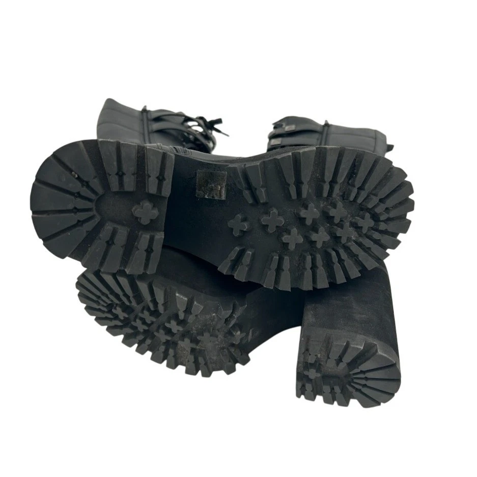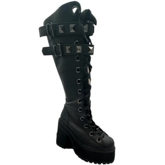 Unleash your inner rebel with these striking Demonia boots. These knee-high boots command attention with their bold design, featuring a lace-up front, studded straps, and a chunky platform sole. The side zipper ensures easy wear, while the sturdy construction promises lasting comfort and style. These boots are perfect for concerts, club nights, or adding an edgy touch to your everyday look.