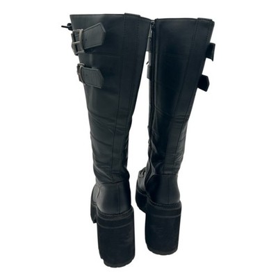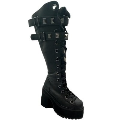 Keywords: Demonia, boots, knee high boots, platform boots, studded boots, goth boots, punk boots, black boots, vegan leather boots, women's boots, size 9, lace up boots, buckle boots, Goth, ASST202/BVL