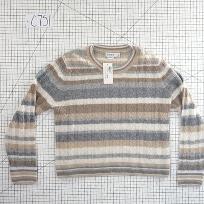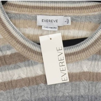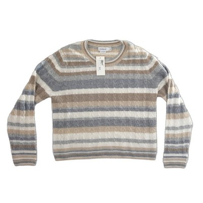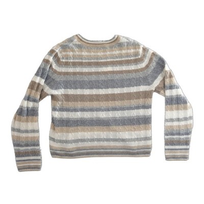 Luxurious 100% cashmere crewneck sweater from Evereve features a sophisticated horizontal stripe pattern in neutral tones of grey, tan, and cream. The delicate cable knit texture adds depth and a classic touch to this soft, lightweight piece. Designed with a comfortable crew neckline and long sleeves, it offers a refined silhouette perfect for layering or wearing on its own. The ribbed cuffs and hem provide a polished finish to this timeless wardrobe essential.