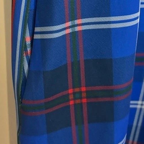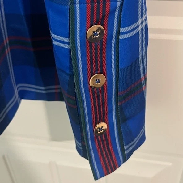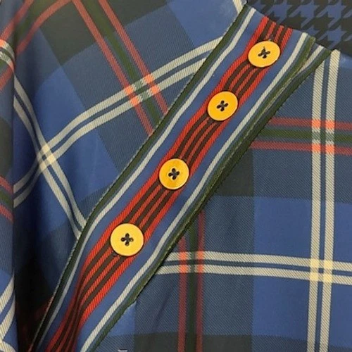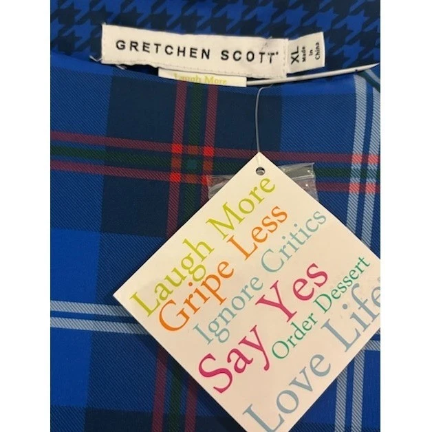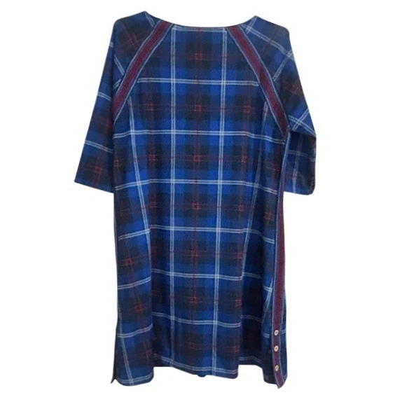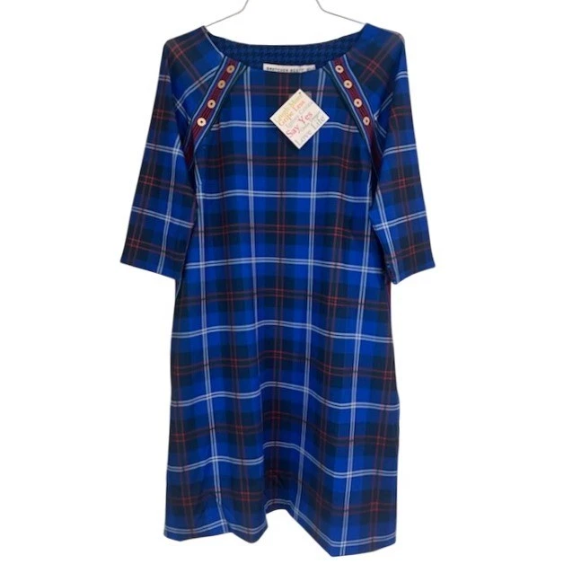 A Gretchen Scott blue plaid knee-length dress with 3/4 sleeves. This charming dress features a distinctive houndstooth accent at the neckline and a decorative trim with button details along the front yoke and side hem. It’s a versatile piece perfect for a casual day out, a weekend brunch, or even a relaxed office environment.