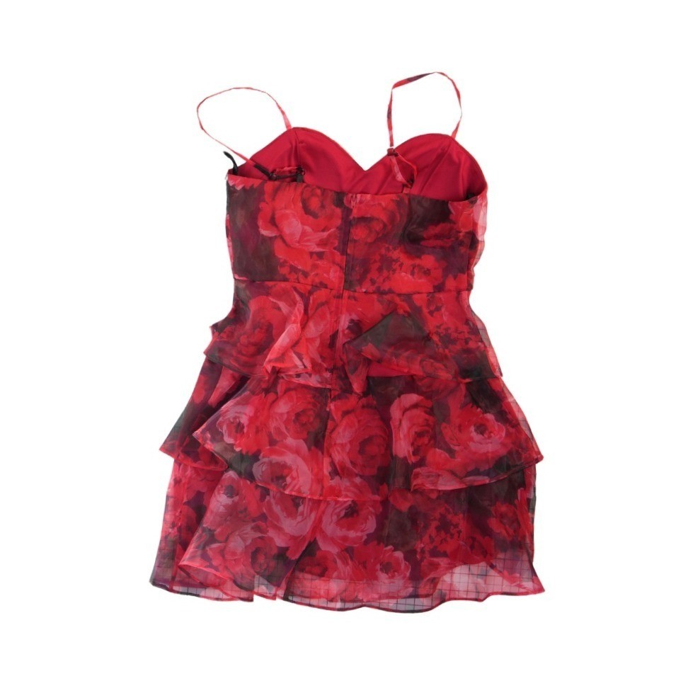 New with tags! Vibrant red floral print mini dress features a romantic sweetheart neckline and adjustable spaghetti straps for a personalized fit. The bodice is structured with a tiered, ruffled skirt that adds playful volume and movement. Crafted from a lightweight, sheer chiffon-like fabric with a full inner lining, this cocktail dress is finished with a hidden back zipper closure.