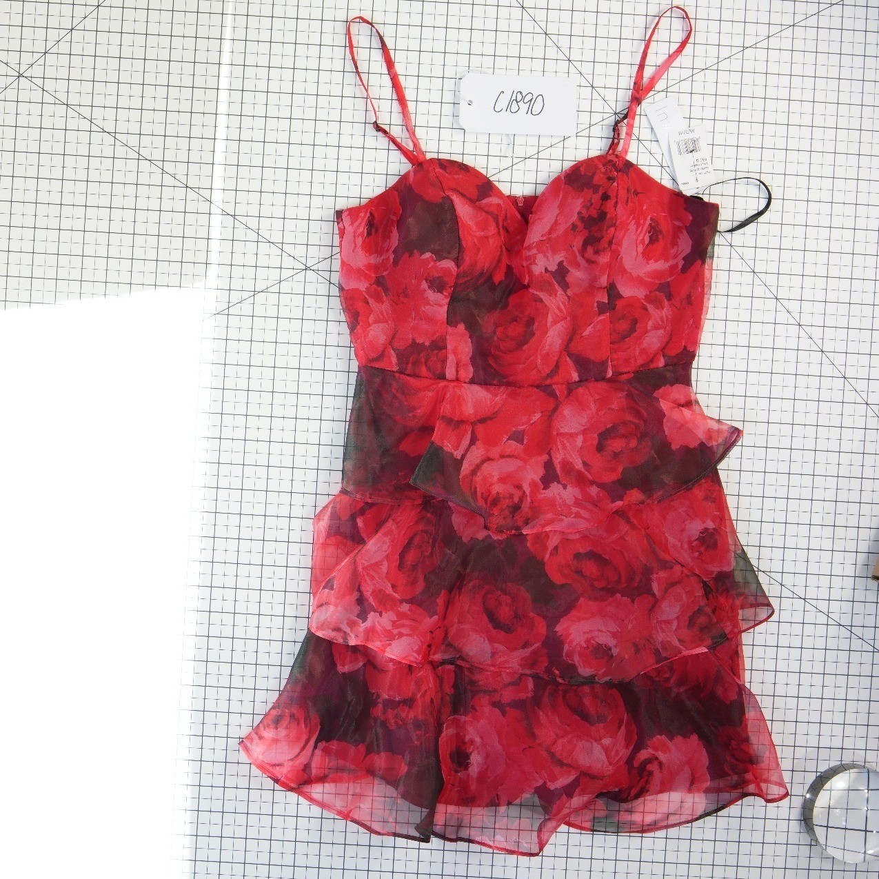 Keywords: Coquette, Romantic, Floralcore, Party Dress, Valentine's Day, Wedding Guest, Tiered Skirt, Rose Print, Feminine, Whimsical, Cocktail Attire, Summer Dress
