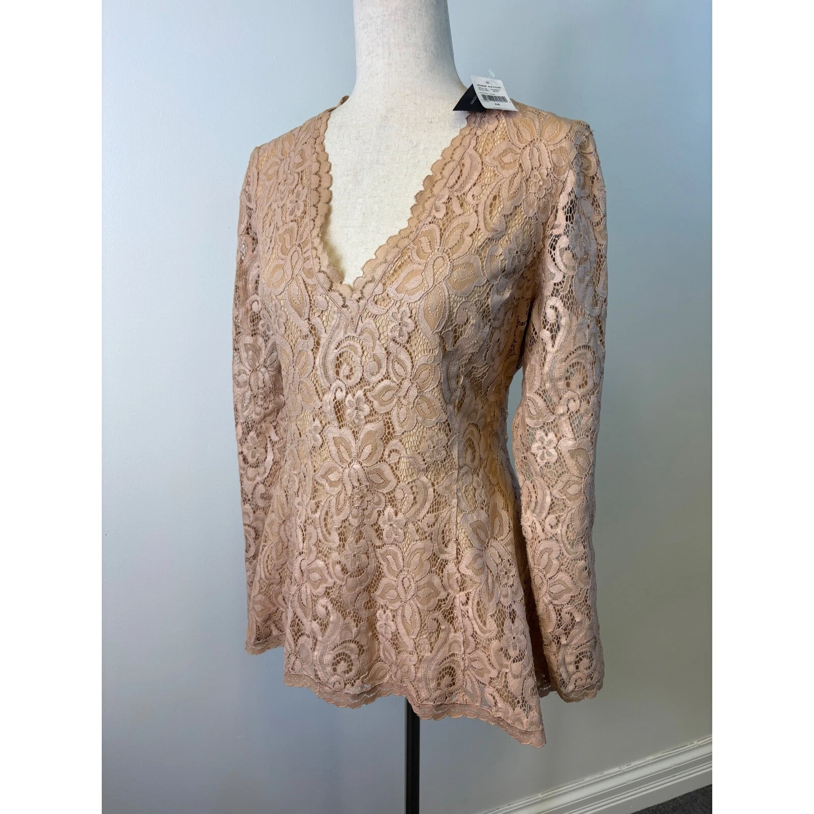 Romantic allure unfolds in this Josie Natori lace peplum top. A vision in delicate nude lace, this top features a flattering V-neckline and long sleeves, creating a sophisticated silhouette. The peplum waist adds a touch of femininity, accentuating the figure with its subtle flare. A full zipper in the back ensures a smooth, seamless fit. Perfect for a special date night, a chic cocktail party, or adding a touch of elegance to your everyday wardrobe, this top is sure to turn heads and make you feel fabulous.