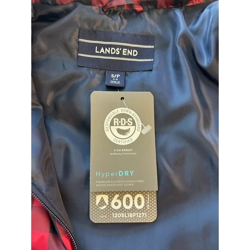 New with tags! Stylish and warm Lands’ End puffer vest featuring a classic red and black buffalo plaid pattern. This down-filled vest provides excellent insulation without being too bulky, making it a perfect layering piece for various weather conditions. The vest features a full zip front, a stand-up collar for added warmth, and a comfortable fit that allows for easy movement. Its lightweight design makes it easy to pack and carry, ideal for travel or outdoor adventures. Wear it on casual weekends, fall hikes, or chilly evenings around a campfire.