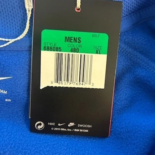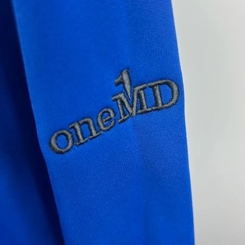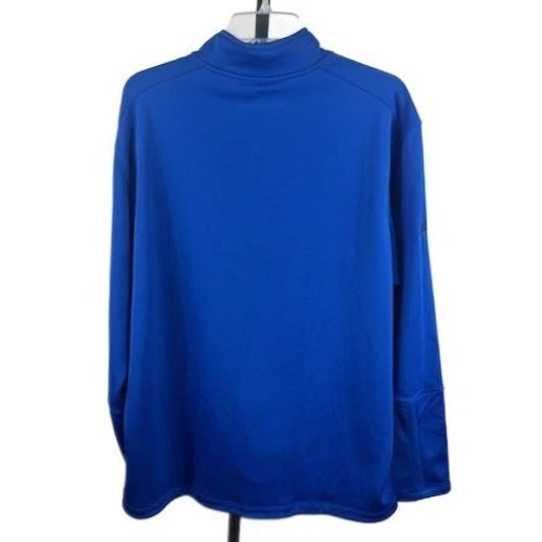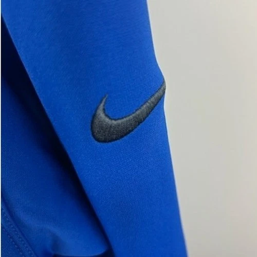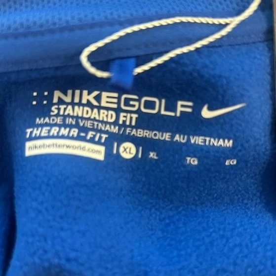 Nike Golf Therma Fit pullover sweatshirt in vibrant blue. Standard fit design with a quarter-zip neckline and long sleeves. Features the iconic Nike swoosh on the left sleeve and the “one 1MD” logo embroidered on the right sleeve. Ideal for a round of golf, casual outings, or athleisure wear.