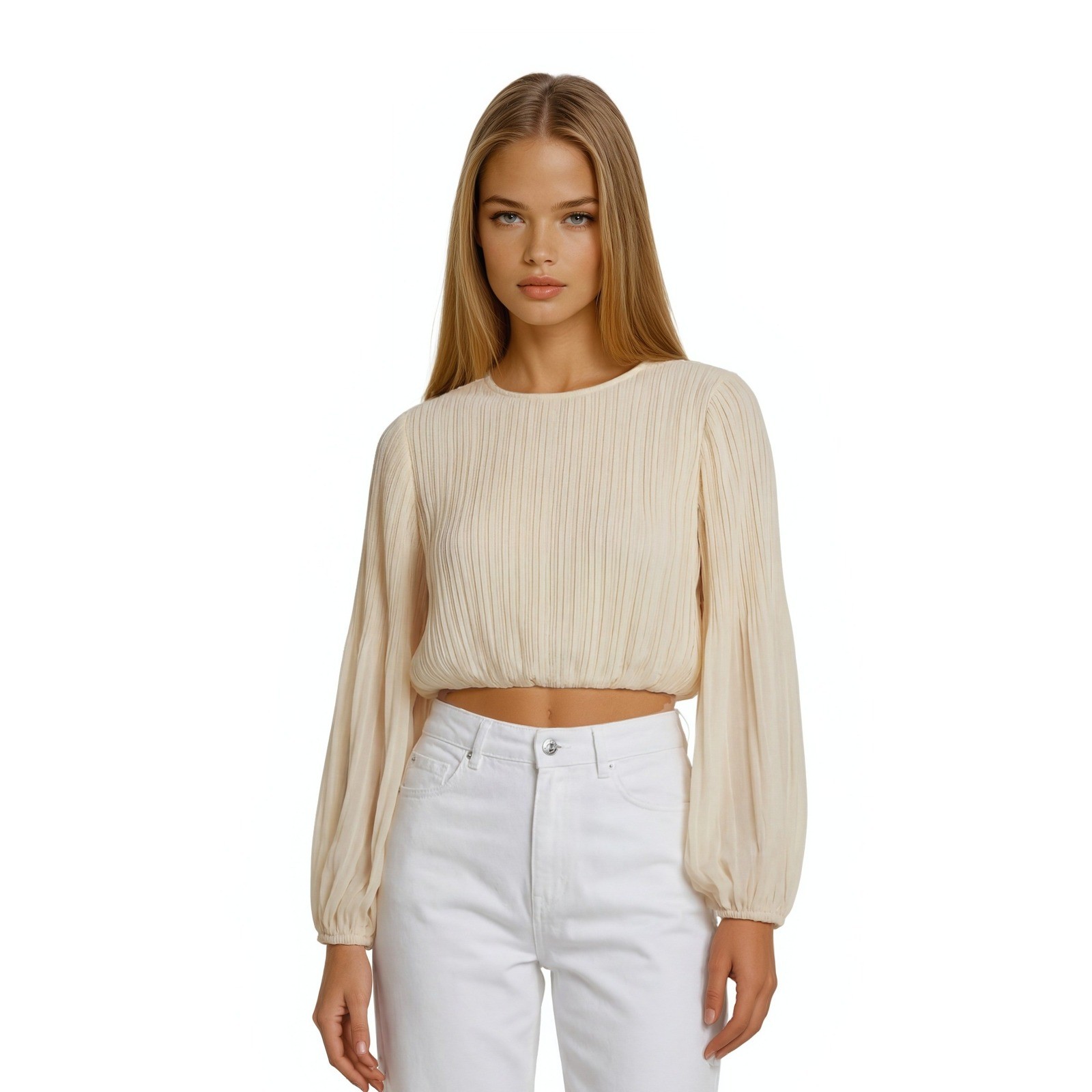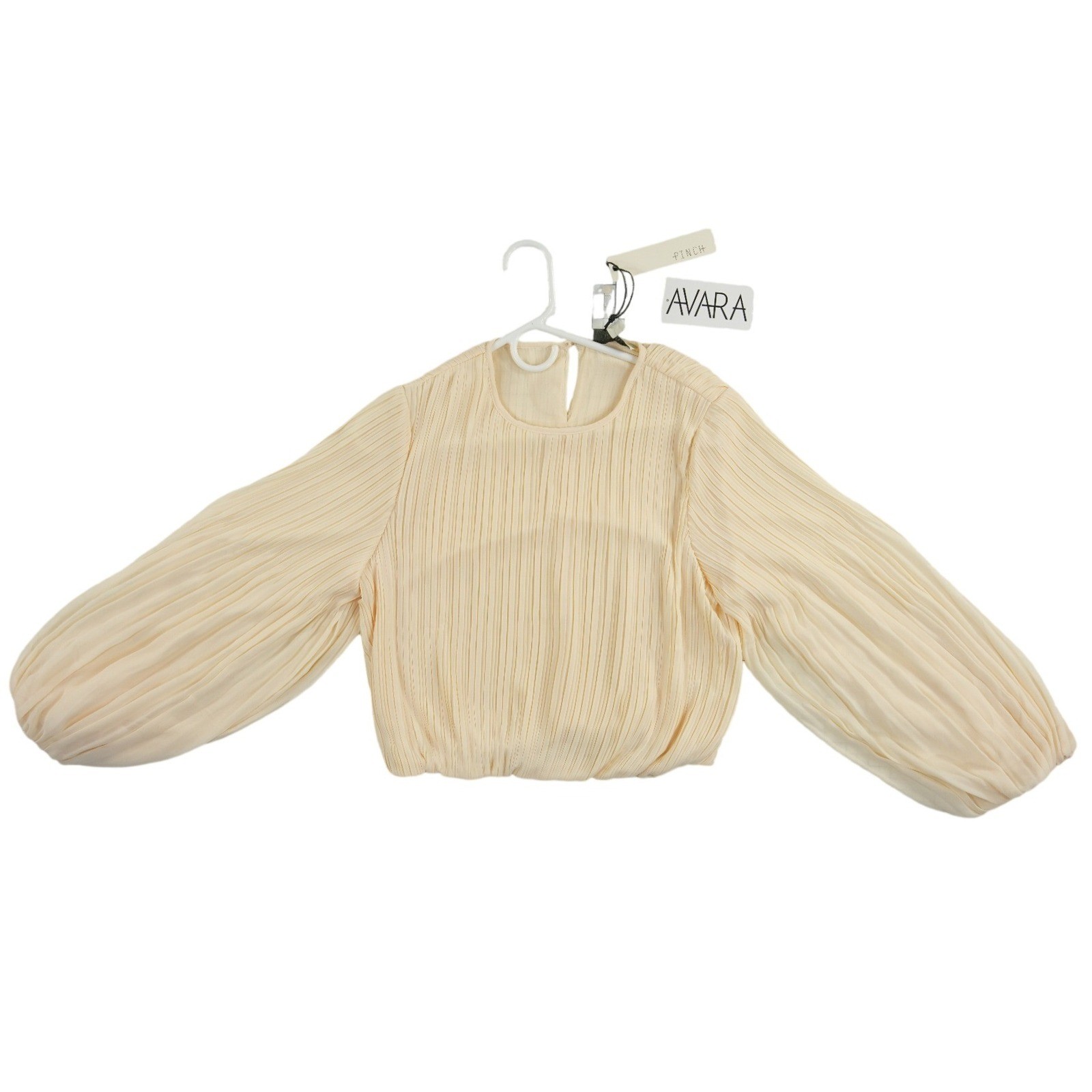 New with tags! Elegant cream-colored blouse features a sophisticated pleated texture throughout the body and sleeves. Designed with a cropped silhouette and voluminous balloon sleeves, this top offers a modern romantic aesthetic. The back includes a keyhole opening with a button closure for a refined finish. Fully lined for comfort and quality, it is perfect for pairing with high-waisted trousers or skirts for a polished look.