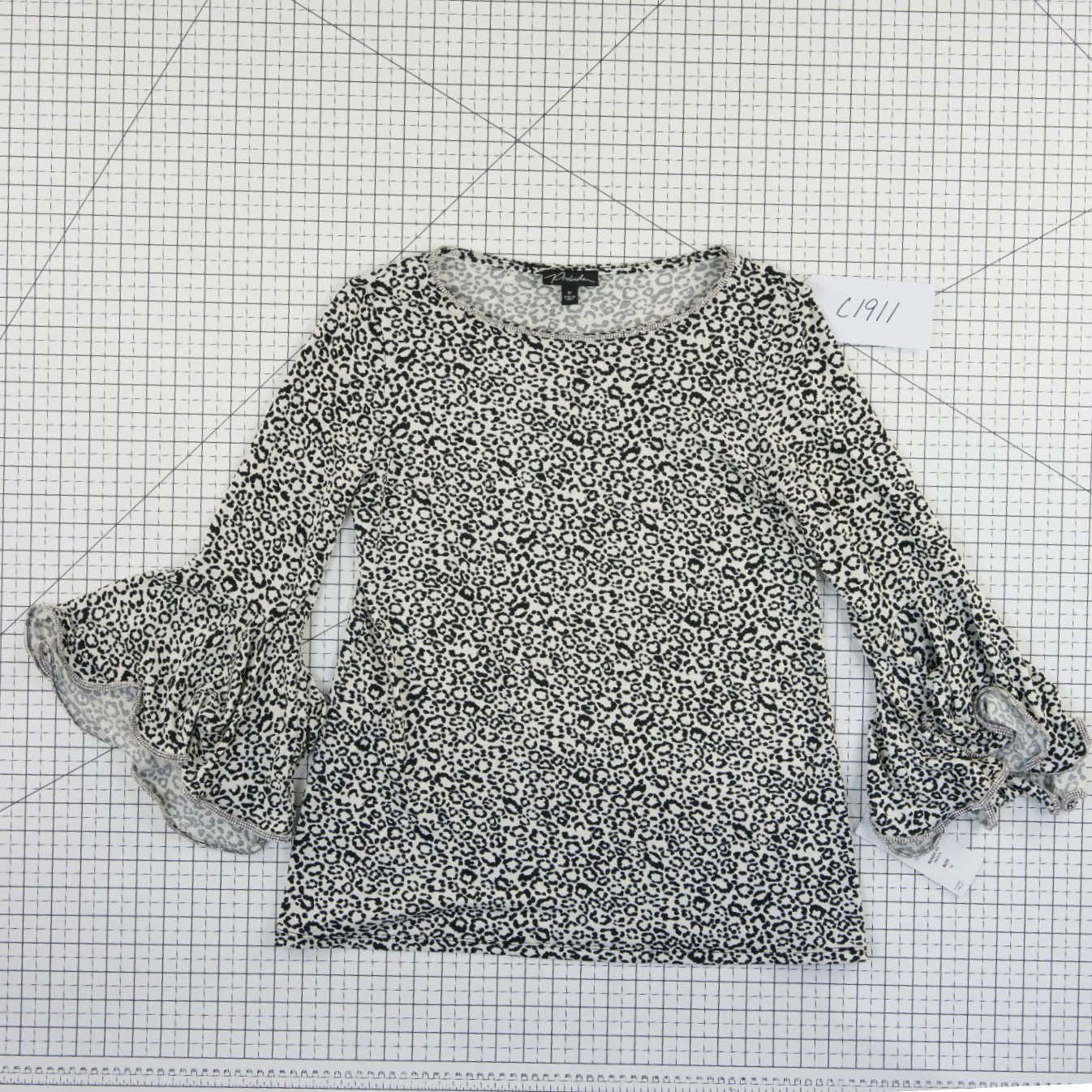 New with tags! Prelude ivory and black leopard print top provides a bold statement with its striking animal pattern and elegant rhinestone-embellished neckline. This long-sleeve blouse features dramatic tiered bell cuffs that add a touch of flair and movement to the silhouette. Crafted from a comfortable stretch blend, it offers a flattering fit suitable for both evening outings and elevated daytime looks.
