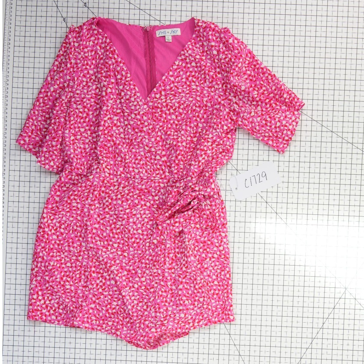 NWT! Vibrant pink romper showcases an eye-catching abstract petal or confetti print in shades of white and red. Designed with a flattering V-neckline and short flutter sleeves, this piece features a cinched waist with a side-tie detail for a defined silhouette. The lightweight woven fabric is fully lined for comfort and finished with a hidden back zipper closure.