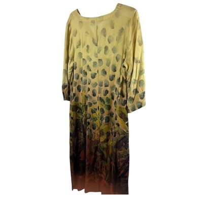 Eye-catching midi dress featuring a vibrant jungle print, perfect for adding a touch of exotic flair to your wardrobe. The dress boasts a flattering V-neckline and relaxed, three-quarter length sleeves, offering both comfort and style. The unique print transitions from an abstract spot pattern at the top to a lush jungle scene at the hem, creating a visually appealing gradient effect. Made from lightweight rayon, this dress drapes beautifully and is ideal for warm weather. Perfect for a garden party, a casual brunch, or a vacation getaway.