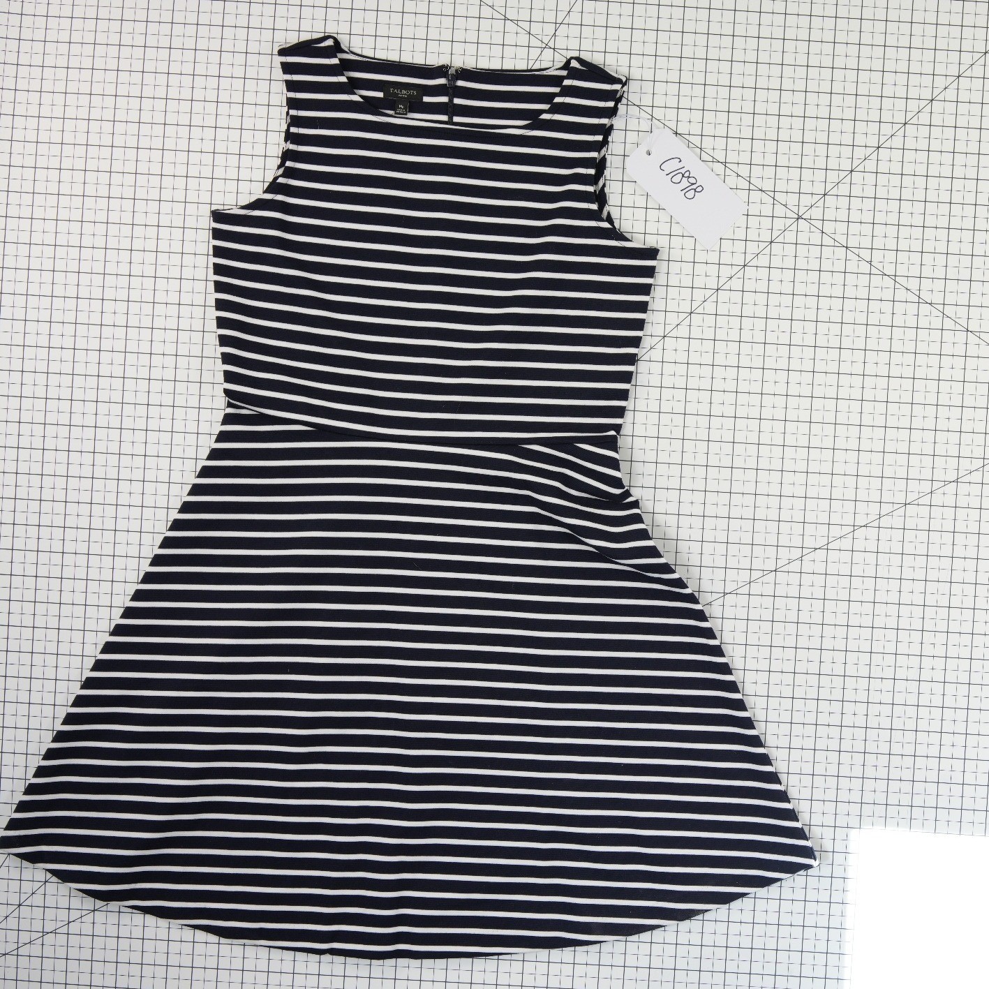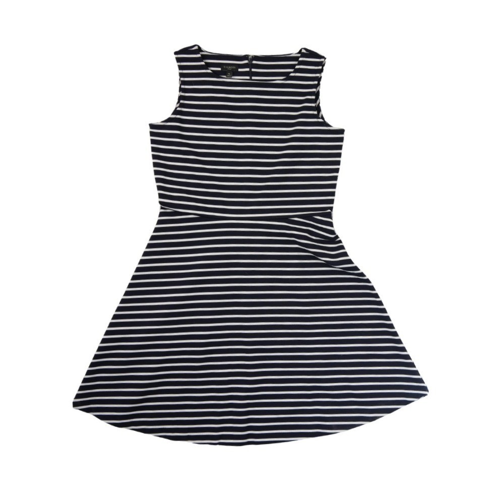 New with tags! Nautical-inspired sleeveless dress features a timeless horizontal stripe pattern in navy blue and white. Designed with a flattering fit-and-flare silhouette, this knit piece offers a comfortable stretch thanks to its ponte-like fabric blend. The back is finished with a discreet zipper closure, making it a versatile choice for office wear, weekend brunches, or coastal vacations.
