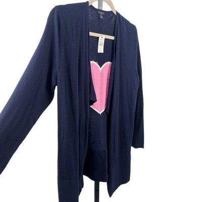 Keywords: Talbots Woman, navy cardigan, heart sweater, open front cardigan, pink heart, plus size sweater, lightweight knit, preppy style, valentines day, layering piece, casual chic, intarsia heart
