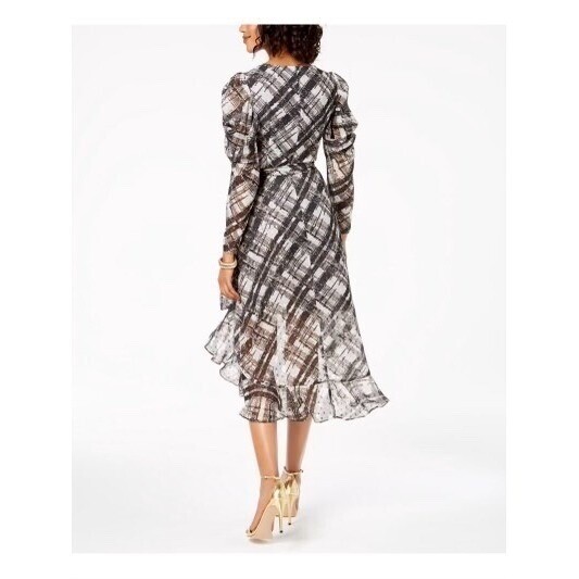 Keywords: Taylor dress, midi dress, plaid dress, hi-lo dress, ruffle hem dress, long sleeve dress, wrap dress, cocktail dress, party dress, women's dress, size 12 dress, black dress, gray dress, v-neck dress