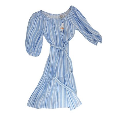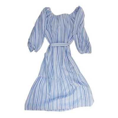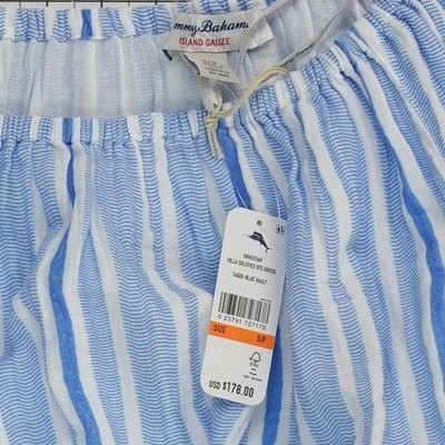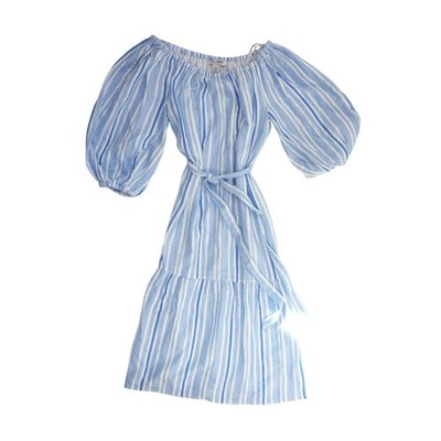 Tommy Bahama Villa Solstice OTS Dress features a breezy island gauze fabric with a classic blue and white vertical stripe pattern. This off-the-shoulder silhouette is designed with voluminous puff sleeves and an elasticized neckline for a comfortable, secure fit. A matching self-tie belt cinches the waist to create a flattering shape, while the tiered skirt adds a playful, feminine touch to the midi-length hem.