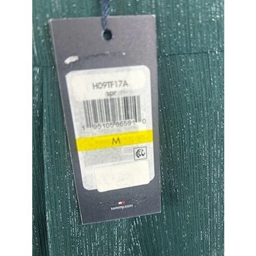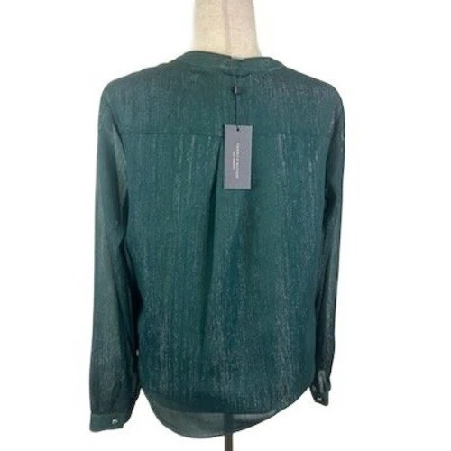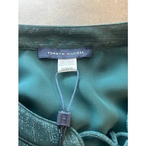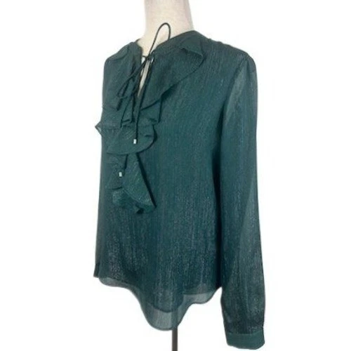 Elegant blouse from Tommy Hilfiger, perfect for adding a touch of sophistication to any outfit. The deep green hue with subtle metallic threading catches the light beautifully, creating a visually stunning effect. Features include a graceful ruffle detail down the front, a tie neckline that can be worn open or tied for a more formal look, and long sleeves with buttoned cuffs. The lightweight fabric drapes nicely, ensuring a comfortable fit. This blouse is ideal for evening events, dinner parties, or adding a polished touch to your work attire.