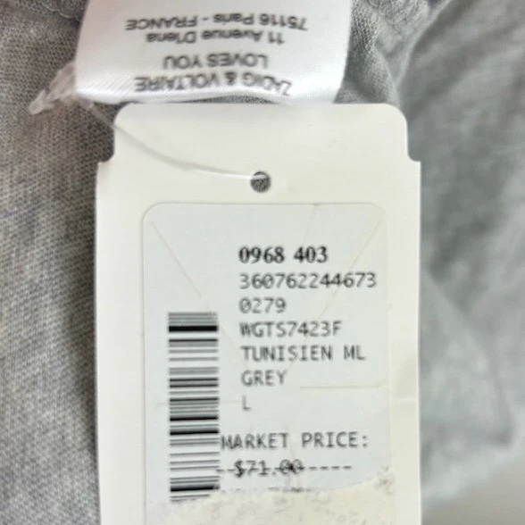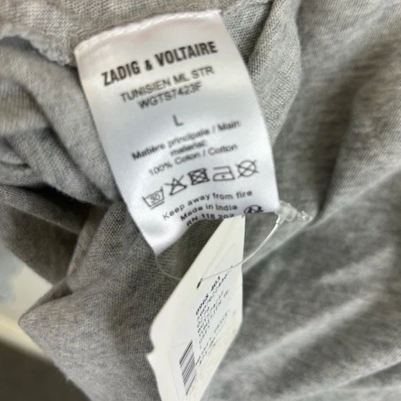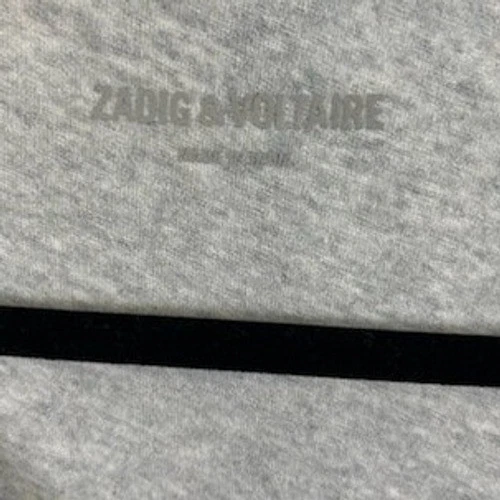 New with tags! Zadig & Voltaire long sleeve t-shirt showcasing a bold skull graphic with a subtle camouflage print detail. The grey knit offers a soft feel, complemented by a relaxed V-neckline with a buttoned placket for a touch of casual flair. Perfect for everyday wear, concerts, or weekend adventures.