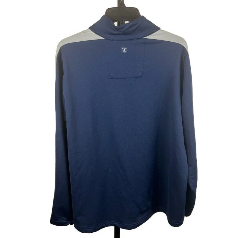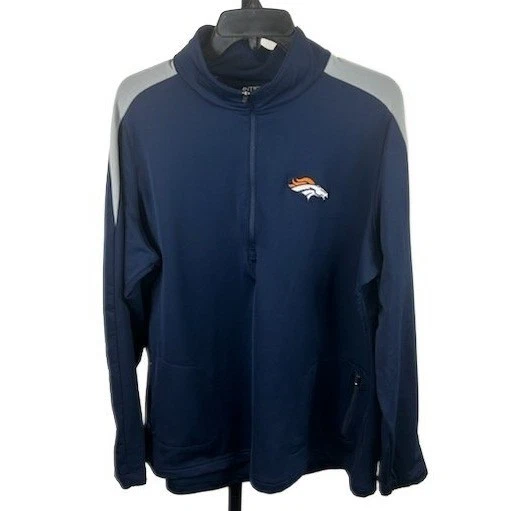 Stylish athletic quarter-zip pullover, ideal for Broncos fans, featuring the Denver Broncos logo prominently displayed on the chest. This women’s extra-large sweatshirt boasts a sleek navy blue body accented with gray shoulder panels, offering a modern and sporty look. This pullover features a convenient quarter-zip design for adjustable comfort and style, and includes a zippered pocket for secure storage. A versatile addition to any wardrobe, it is suited for casual outings, workouts, or simply displaying team pride on game day, as well as comfortable to wear while running errands.