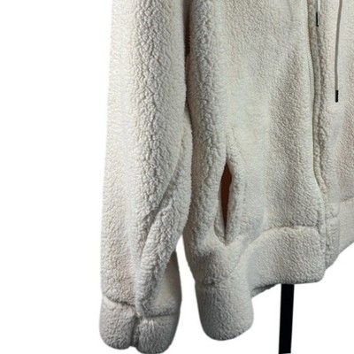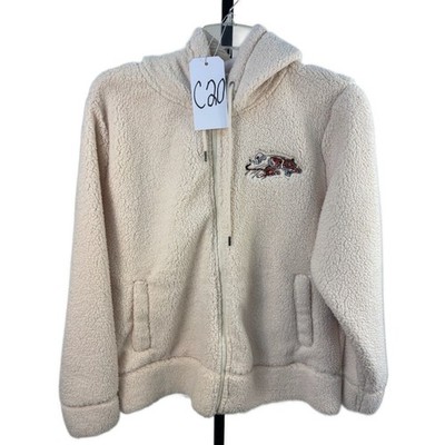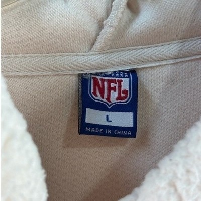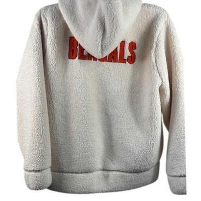 Cincinnati Bengals NFL sherpa fleece full zip hoodie jacket in cream with embroidered tiger logo on the chest and 'Bengals' text on the back. Features a full zip front closure, attached hood with drawstring, and two front hand pockets. This cozy jacket is perfect for game days or casual wear.
