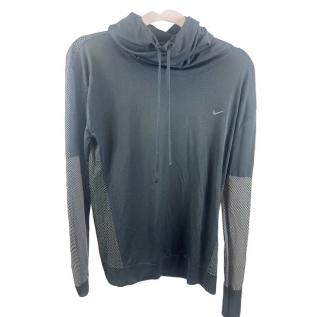 Elevate your active ensemble with this sleek Nike Dri-FIT pullover. A streamlined silhouette with athletic flair, this top drapes effortlessly, promising both comfort and performance. The unique cowl neck adds a touch of modern sophistication, while the contrasting sleeve panels inject visual interest. A subtle Nike swoosh sits proudly on the chest, signaling quality and design. Envision yourself conquering an early morning run, hitting a yoga class, or simply enjoying a relaxed weekend brunch in this versatile piece.