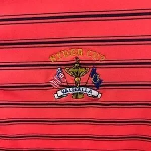 Elevate your golf game with this vibrant polo shirt. A striking red backdrop is punctuated by sleek black stripes, creating a visually dynamic piece. The shirt features an embroidered Ryder Cup Valhalla emblem, adding a touch of prestige and exclusivity. Designed for performance, it offers a comfortable fit and allows for a full range of motion. Perfect for a day on the golf course, a casual weekend outing, or even a relaxed business-casual setting.