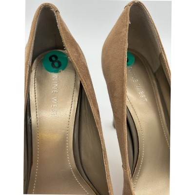Nine West taupe suede peep toe heels. These stylish shoes feature a stacked heel and a classic peep toe silhouette, perfect for adding a touch of sophistication to any outfit. Dress them up for a night out or wear them to the office for a polished look.
