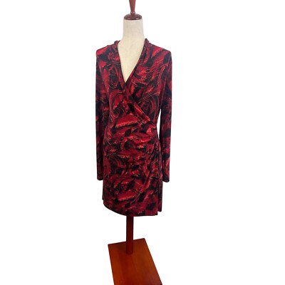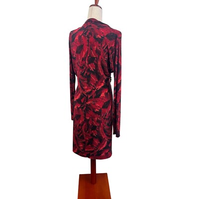 Command attention in this Norma Kamali wrap dress, a symphony of bold red and black feather prints that dance across the fabric. The flattering wrap design cinches at the waist, creating an hourglass silhouette that exudes confidence and sophistication. Long sleeves add a touch of elegance, making it perfect for cooler evenings. The deep V-neckline adds a hint of allure, while the comfortable fabric ensures you can move with ease. This dress is a statement piece that will turn heads wherever you go. Ideal for a cocktail party, a night out on the town, or a special date. Like new, no flaws!
