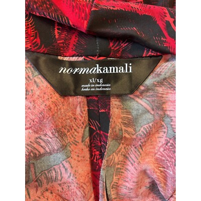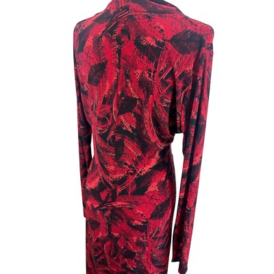 Keywords: Norma Kamali, wrap dress, feather print, long sleeve, cocktail dress, party dress, red dress, black dress, womens dress, XL dress, XG dress, plus size dress, designer dress, evening dress, statement dress