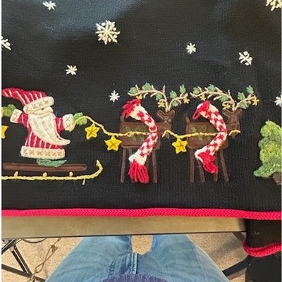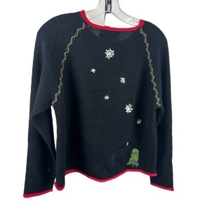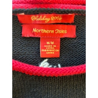 Keywords: Christmas sweater, holiday sweater, Santa sweater, reindeer sweater, black sweater, embroidered sweater, festive sweater, holiday apparel, crew neck sweater, winter sweater, Christmas party, Northern Isles, 2004, vintage holiday