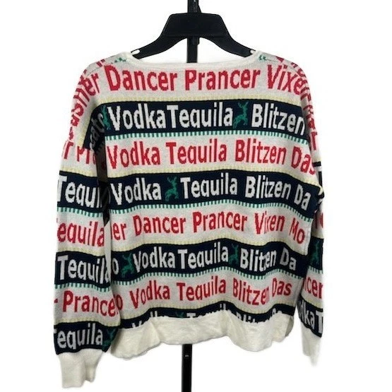 Festive crewneck sweater featuring a playful mix of holiday cheer and party spirit. This eye-catching piece is adorned with reindeer motifs alongside words like ‘Dancer’, ‘Prancer’, ‘Vixen’, ‘Vodka’, ‘Tequila’, and ‘Blitzen’. The sweater has a round neck and long sleeves, making it a comfortable and stylish choice for casual outings. Ideal for holiday parties, cozy nights in, or adding a touch of humor to your winter wardrobe.