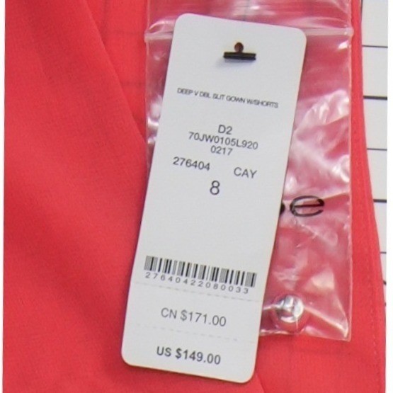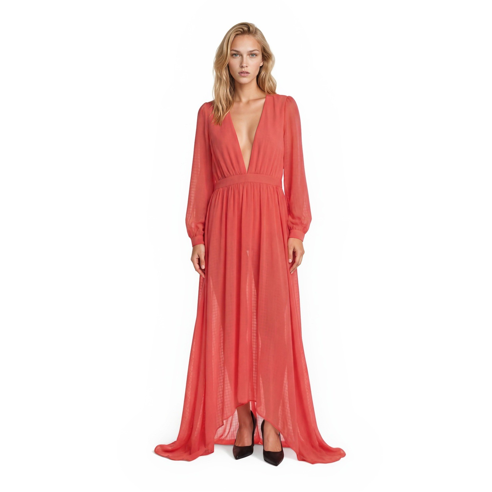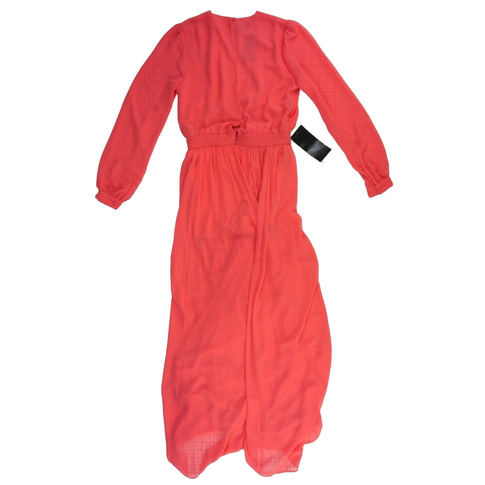 New with tags! Flowy maxi gown features a striking deep V-neckline and long sleeves with buttoned cuffs, creating an elegant and sophisticated silhouette. The vibrant coral fabric is accented with a subtle tonal grid pattern throughout, while a high front slit adds a touch of allure to the floor-length skirt. Designed with a defined waist and a lightweight, airy feel, this dress is perfect for formal events, evening galas, or upscale summer parties.