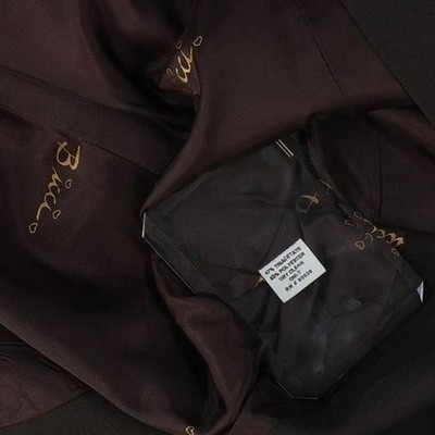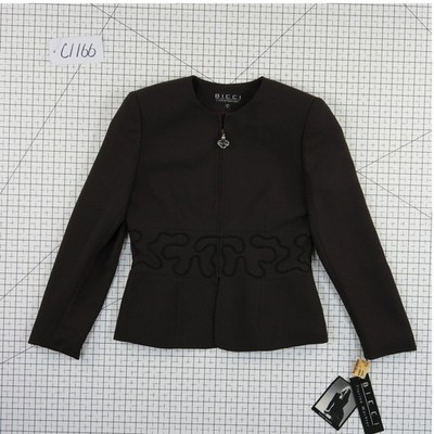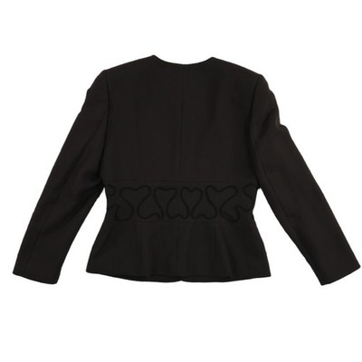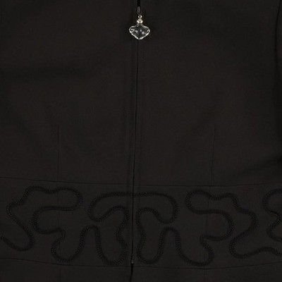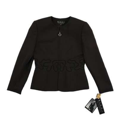 New with tags. Vintage structured jacket features an elegant collarless neckline and a unique heart-shaped crystal zipper pull. The waist is accentuated by a decorative soutache embroidery trim that wraps around the torso, creating a sophisticated peplum-like silhouette. Fully lined with a signature logo print fabric, this piece offers a tailored fit perfect for professional or formal occasions. Made in the USA.