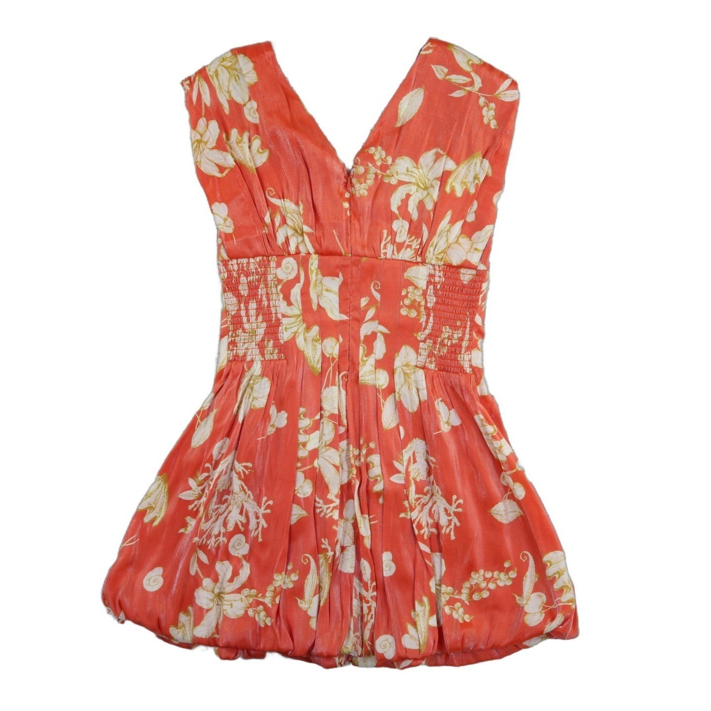 New with Tags! Vibrant coral mini dress with a whimsical white tropical and shell print. This sleeveless piece features a flattering V-neckline, pleated bodice, and a unique bubble hem that adds playful volume. The back is designed with smocked elastic panels for a comfortable, flexible fit and a hidden zipper closure. Crafted from a textured rayon-nylon blend with a slight sheen, it is fully lined for a smooth feel.