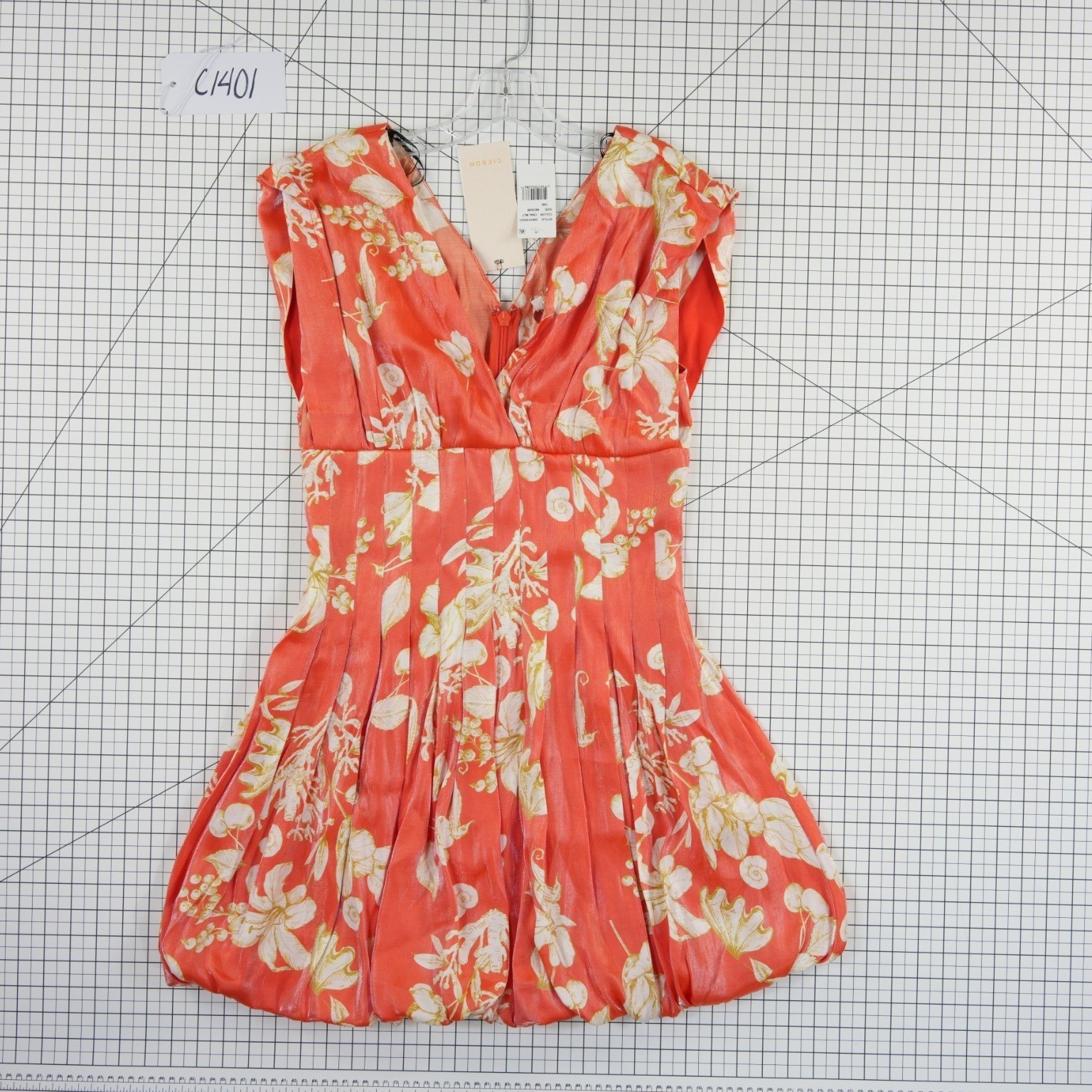 New with Tags! Vibrant coral mini dress with a whimsical white tropical and shell print. This sleeveless piece features a flattering V-neckline, pleated bodice, and a unique bubble hem that adds playful volume. The back is designed with smocked elastic panels for a comfortable, flexible fit and a hidden zipper closure. Crafted from a textured rayon-nylon blend with a slight sheen, it is fully lined for a smooth feel.