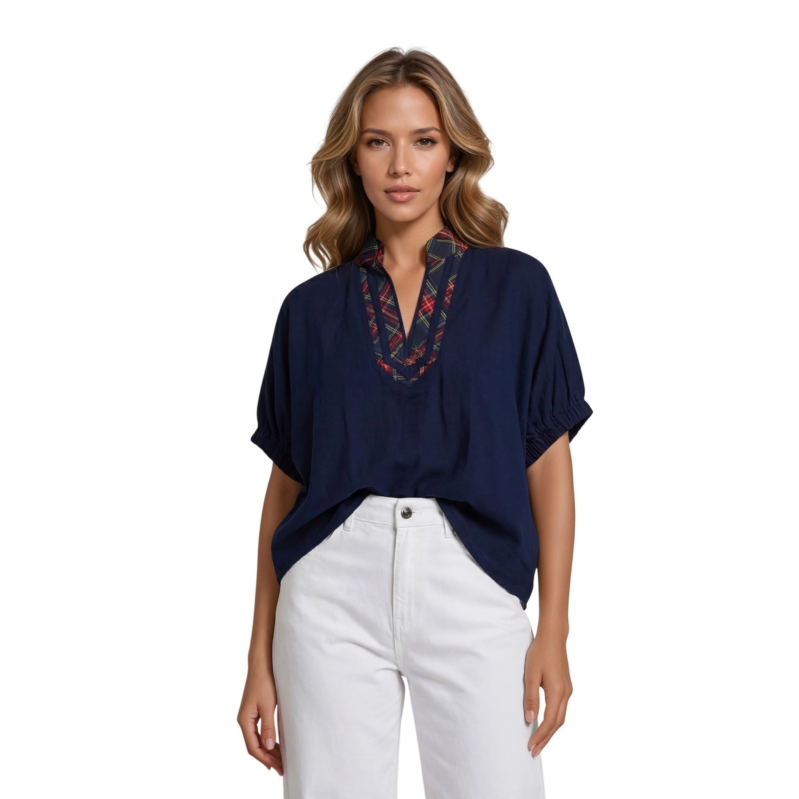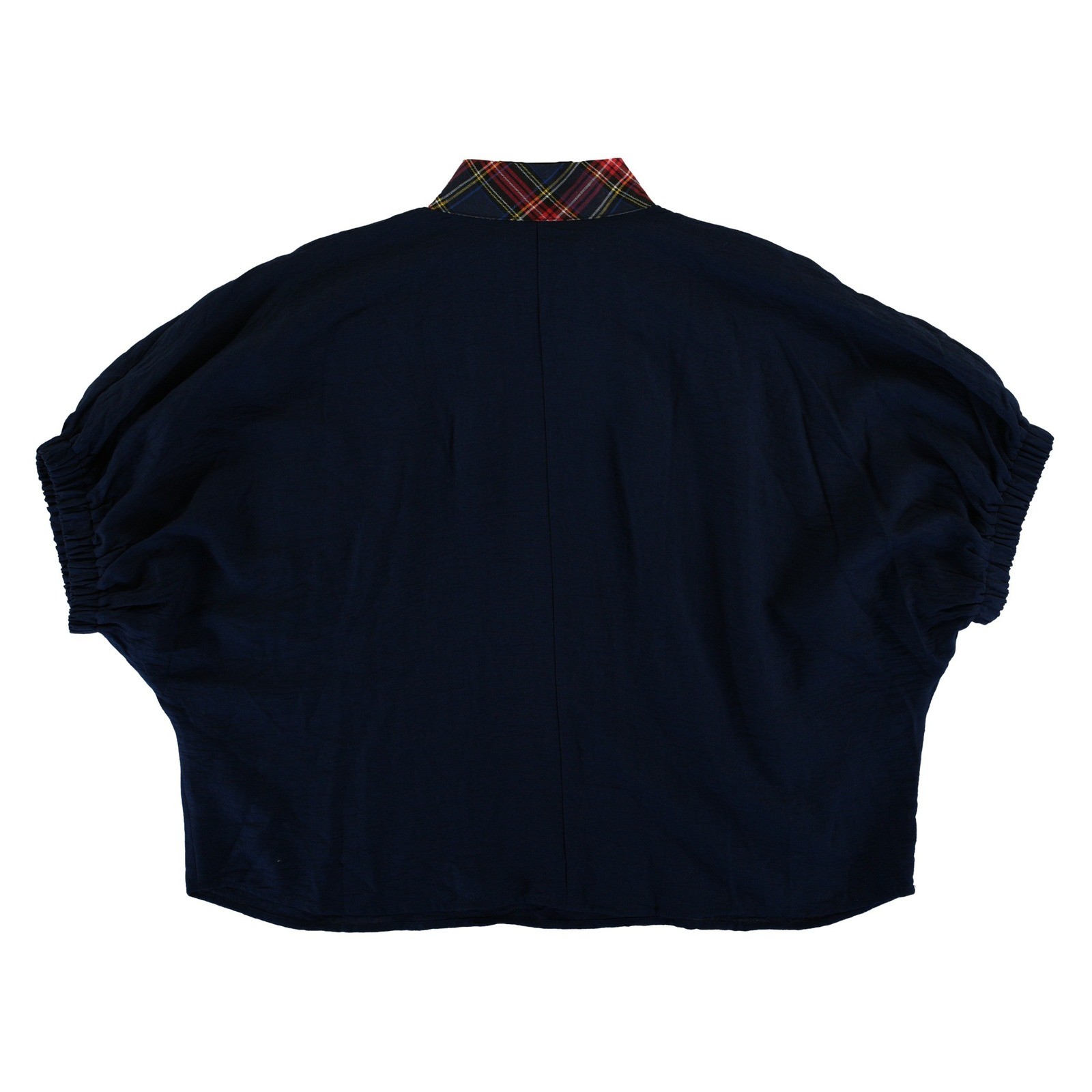 Navy blue dolman sleeve top features a contrasting plaid collar and V-neck placket for a preppy, academic look. Crafted from a lightweight rayon-blend fabric, it has a relaxed, oversized silhouette with elasticized cuffs that create a puffed sleeve effect. The deep navy body is accented by a vibrant red and green tartan pattern, making it a versatile piece for transitional weather.