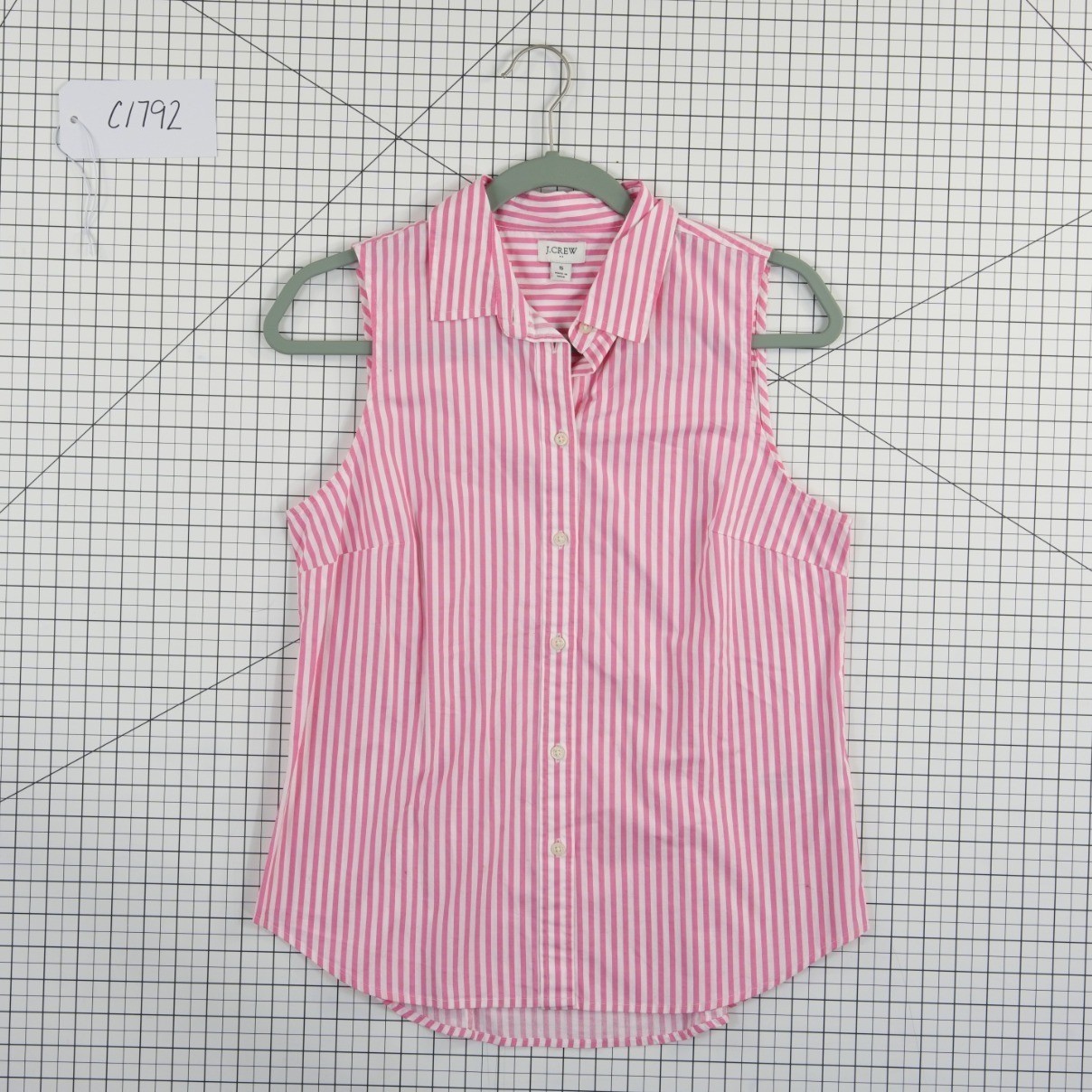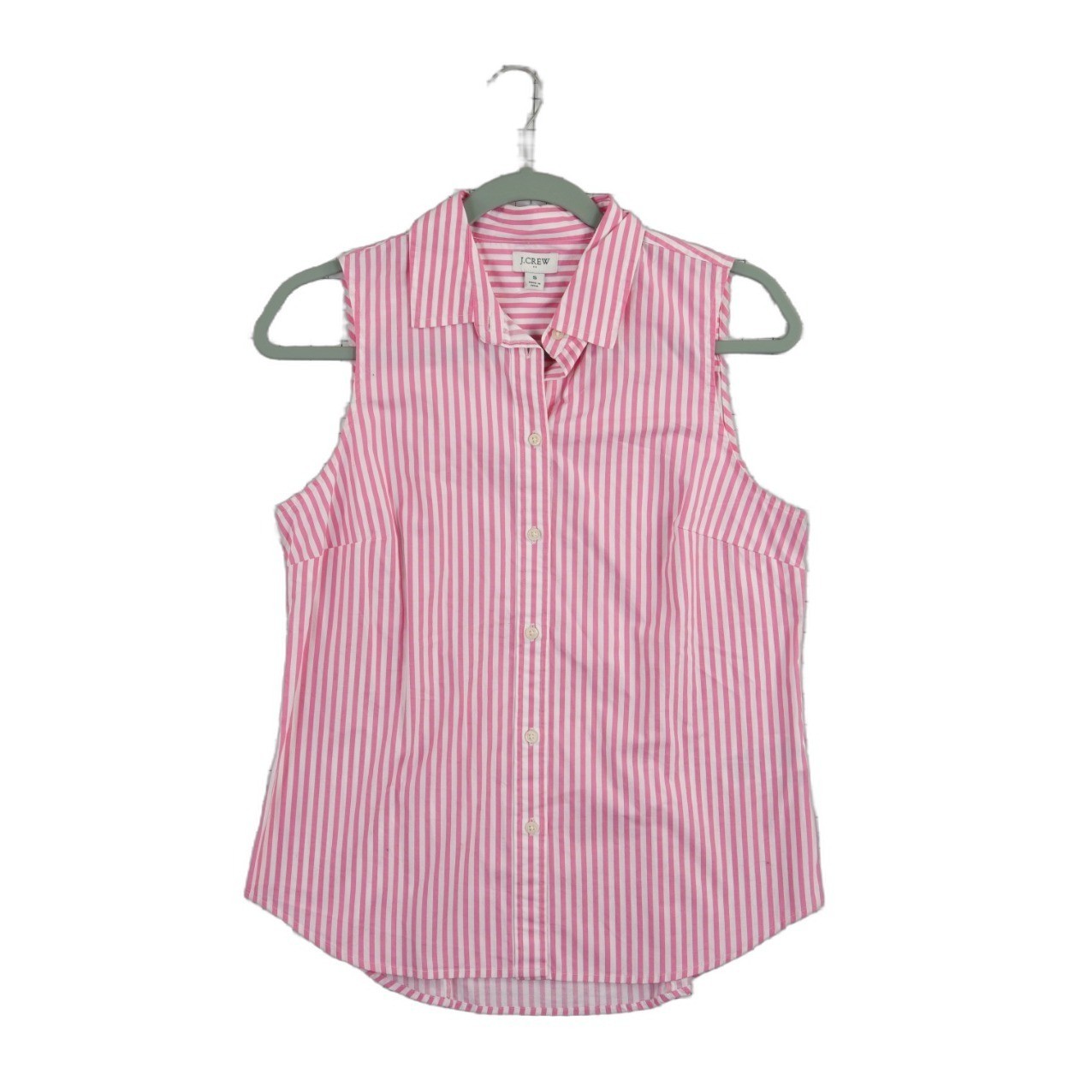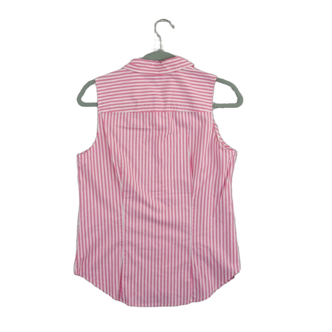 New with Tags! Classic sleeveless button-down shirt features a crisp pink and white vertical stripe pattern in a comfortable stretch cotton blend. Designed with a pointed collar, full button-front closure, and a slightly curved hem for a polished look that works well tucked in or worn out. The back includes vertical darts for a tailored, feminine fit through the torso.