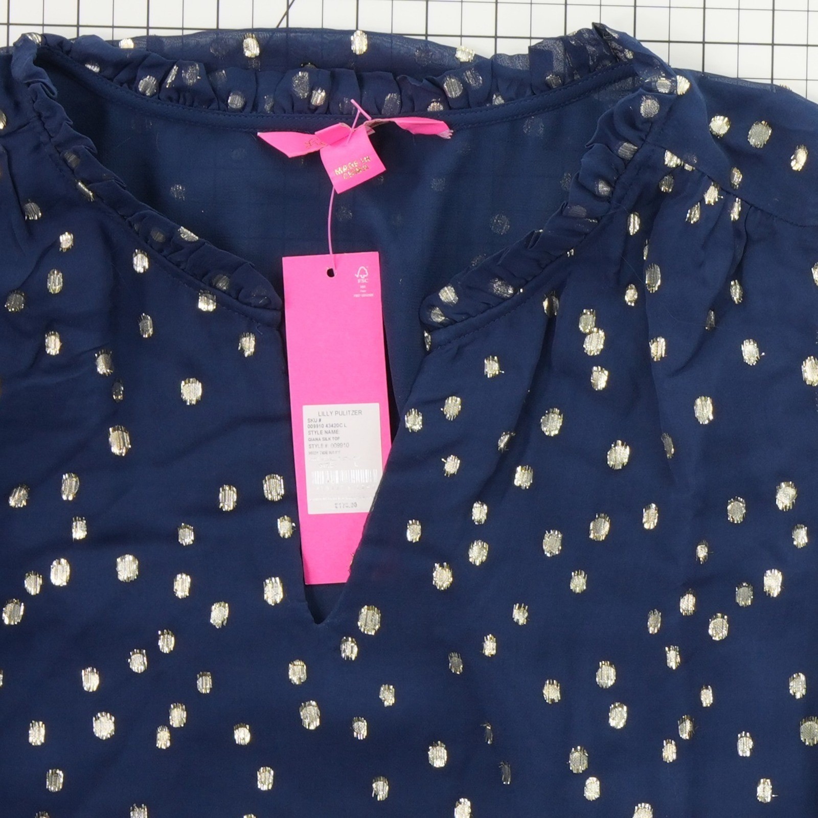 New with Tags! Lilly Pulitzer Diana silk top features a stunning navy blue hue accented with metallic gold foil polka dots for a festive touch. Crafted from a luxurious silk blend, this blouse offers a lightweight feel with a subtle sheen, complemented by a comfortable polyester lining. The design includes a ruffled split neckline and long billowy sleeves with elastic cuffs, creating a sophisticated yet relaxed silhouette perfect for evening events or holiday gatherings.