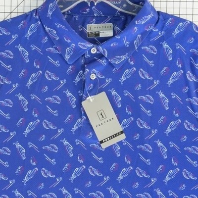 PGA Tour Pro Series performance polo features a vibrant blue base with an all-over novelty print of golf bags and clubs. Designed for the active golfer, this short-sleeve shirt is crafted from a breathable polyester-elastane blend that offers moisture-wicking properties and a comfortable stretch. The classic three-button placket and crisp collar provide a polished look suitable for both the course and the clubhouse.