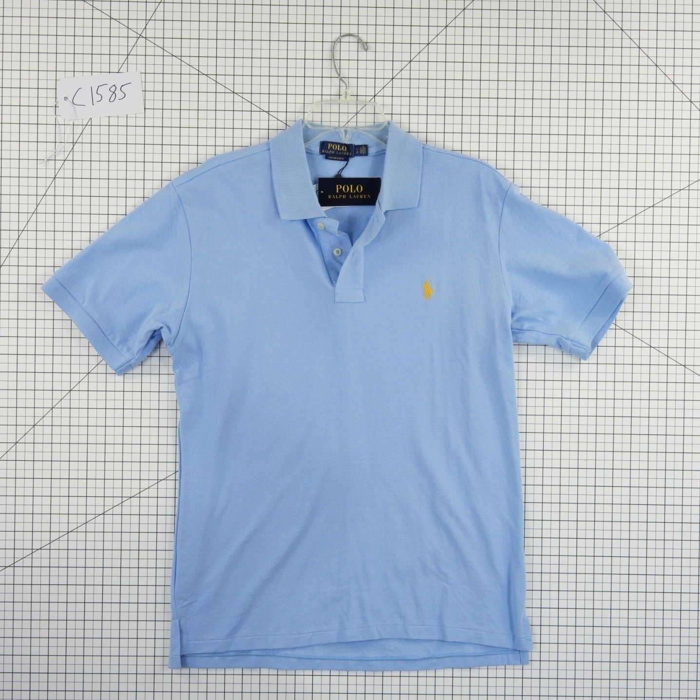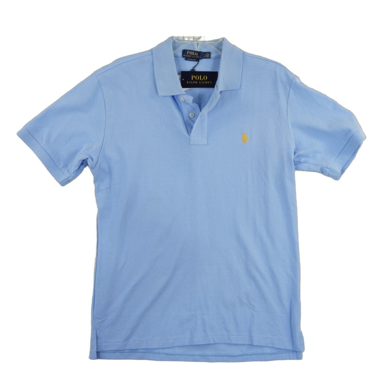 New with Tags! Polo Ralph Lauren short sleeve polo shirt in a light blue shade features the iconic yellow pony embroidery on the chest. Crafted from breathable cotton piqué, this custom slim fit top offers a modern silhouette with a classic ribbed collar and two-button placket. Perfect for a polished casual look, it transitions easily from the golf course to weekend outings.