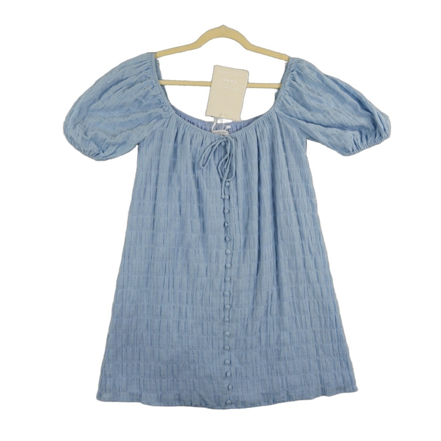 New with Tags! Lightweight cotton mini dress features a textured seersucker-style fabric with a flattering square neckline and puff sleeves. The front is detailed with a functional button-down placket and a delicate tie at the bust, creating a charming peasant-inspired silhouette. Designed with a relaxed fit through the body, this piece offers a breezy, feminine aesthetic perfect for warm weather.