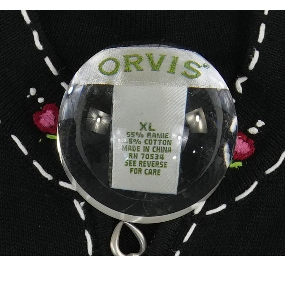 Excellent Condition! Orvis full-zip vintage cardigan sweater crafted from a durable ramie and cotton knit blend. This black knit piece features intricate floral and heart embroidery in pink, red, and green along the front hem, complemented by white contrast whipstitch detailing along the collar, zipper, and princess seams. The mock neck silhouette and silver-tone heart-shaped zipper pull add a charming touch to this classic layering piece.