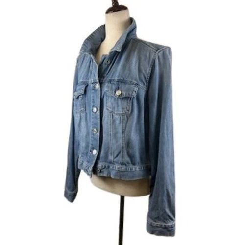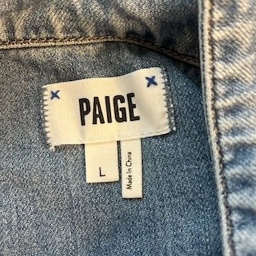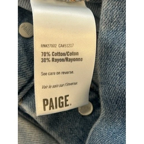 Classic denim jean jacket from PAIGE in a versatile light wash. This essential outerwear piece features a traditional button-front closure, dual chest pockets with button detailing, and a comfortable classic fit. The denim has a subtle distressed look for added character. Perfect for layering over casual outfits or adding a touch of cool to a more dressed-up look.