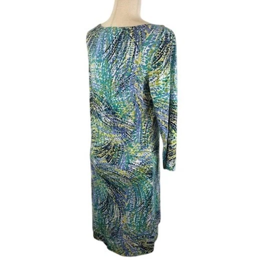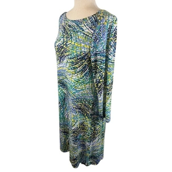 Striking knee-length dress featuring a vibrant abstract print. This dress showcases a captivating blend of blues, greens, yellows, and blacks, creating a visually appealing and versatile design. A round neckline is accented by decorative buttons on the shoulder adding a touch of detail and charm. The long sleeves provide extra coverage, making it suitable for year-round wear. Its flowing silhouette ensures a comfortable fit. This dress is perfect for casual outings, brunch with friends, or even a relaxed day at the office.