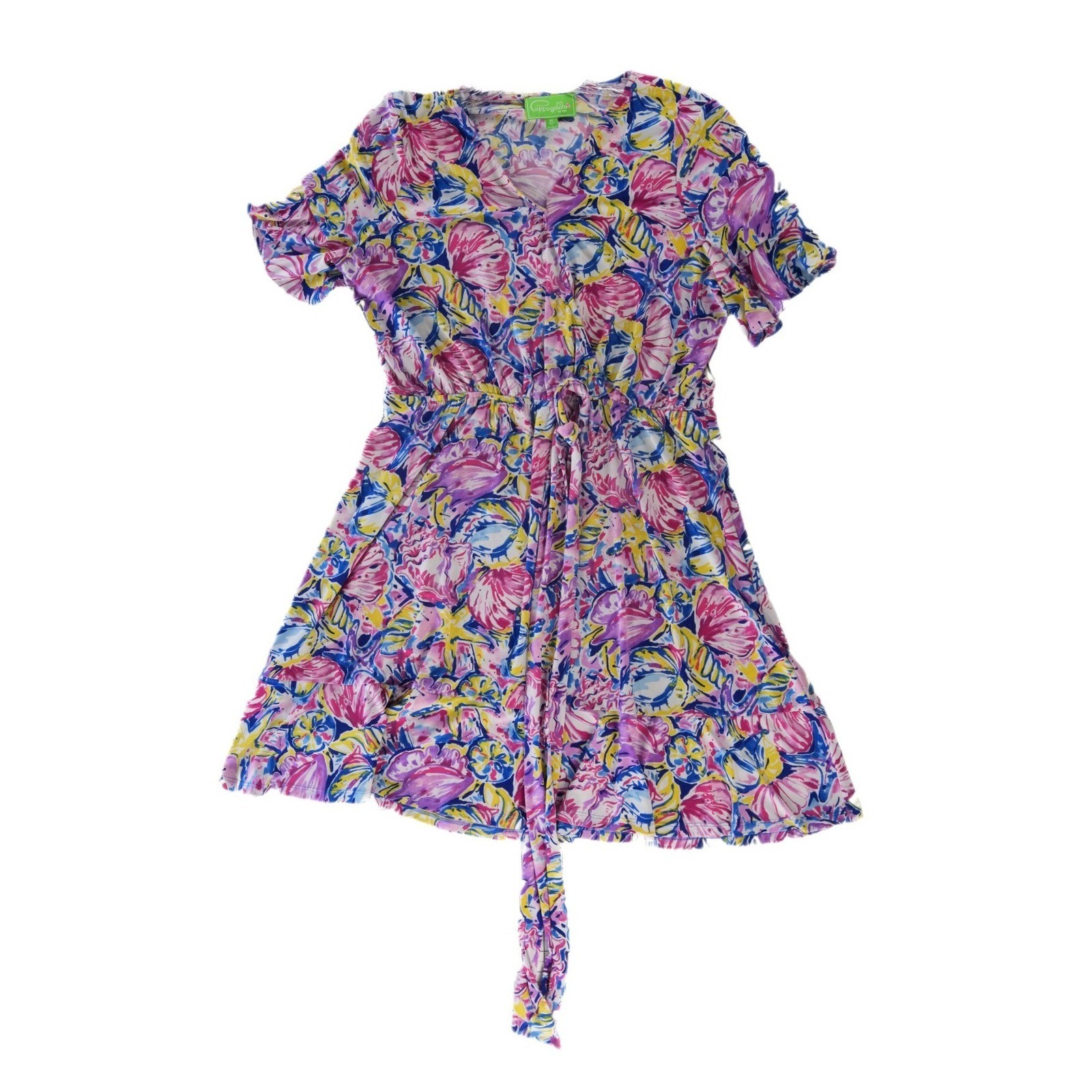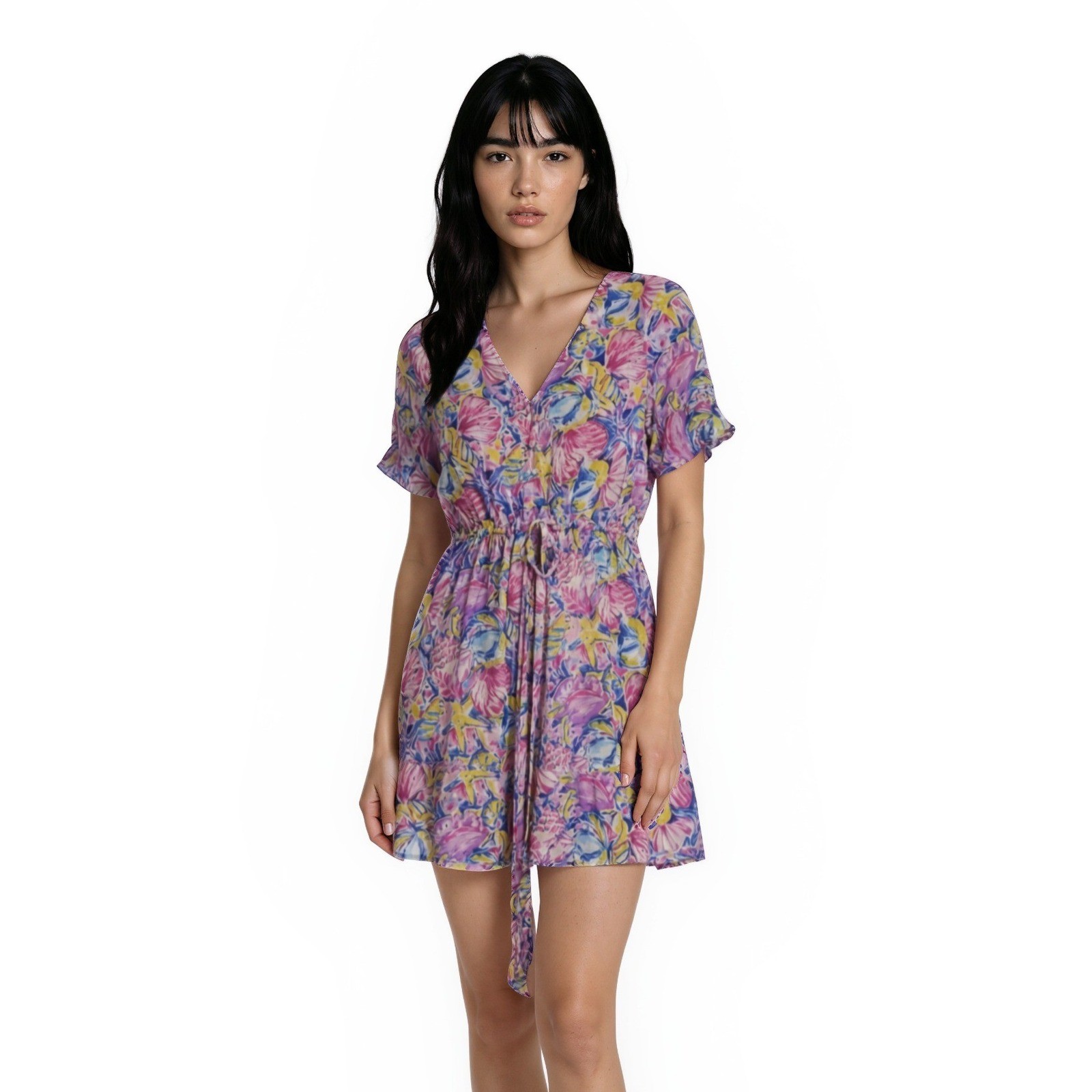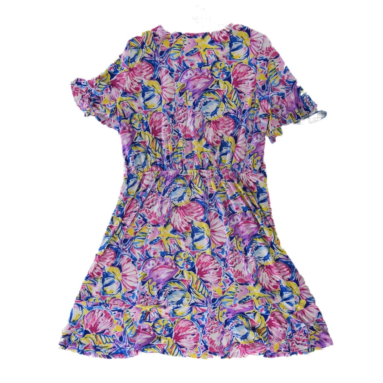 Vibrant coastal dress features a lively seashell and starfish print in shades of pink, blue, and yellow. Designed with a flattering V-neckline and short flutter sleeves, it includes an elasticized drawstring waist to define the silhouette and a playful ruffled hem for added movement. The lightweight fabric makes it an ideal choice for tropical vacations, beach outings, or casual summer gatherings.
