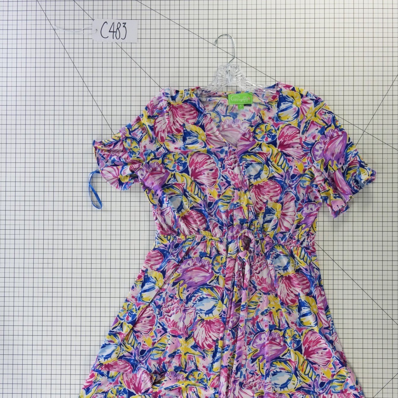 Keywords: Beachy, Tropical, Nautical, Preppy, Bright, Colorful, Coastal Grandmother, Shell Print, Summer Dress, Resortwear, Sun Dress, Flutter Sleeve, Airy, Whimsical, Ocean Theme
